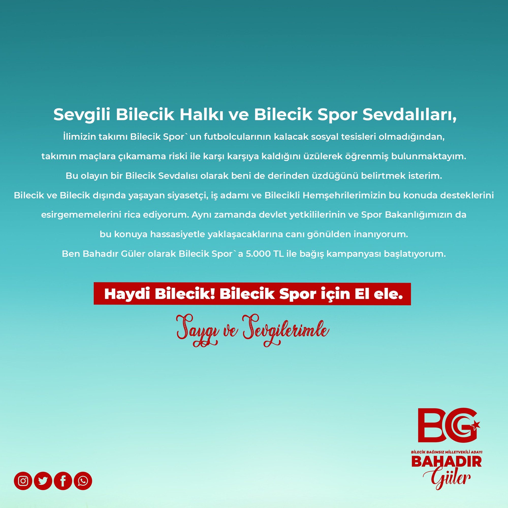 “Sevgili Bilecik Halkı ve Bilecik Spor Sevdalıları, İlimizin takımı Bilecik Spor’un futbolcularının kalacak sosyal tesisleri olmadığından, takımın maçlara çıkamama riski ile karşı karşıya kaldığını üzülerek öğrenmiş bulunmaktayım. Bu olayın bir Bilecik Sevdalısı olarak beni de derinden üzdüğünü belirtmek isterim. Bilecik ve Bilecik dışında yaşayan siyasetçi, iş adamı ve Bilecikli Hemşehrilerimizin bu konuda desteklerini esirgememelerini rica ediyorum. Aynı zamanda devlet yetkililerinin ve Spor Bakanlığımızın da bu konuya hassasiyetle yaklaşacaklarına canı gönülden inanıyorum. Ben Bahadır Güler olarak Bilecik Spor`a 5.000 TL ile bağış kampanyası başlatıyorum. Haydi Bilecik Bilecik Spor için El ele. Saygı ve Sevgilerimle…”