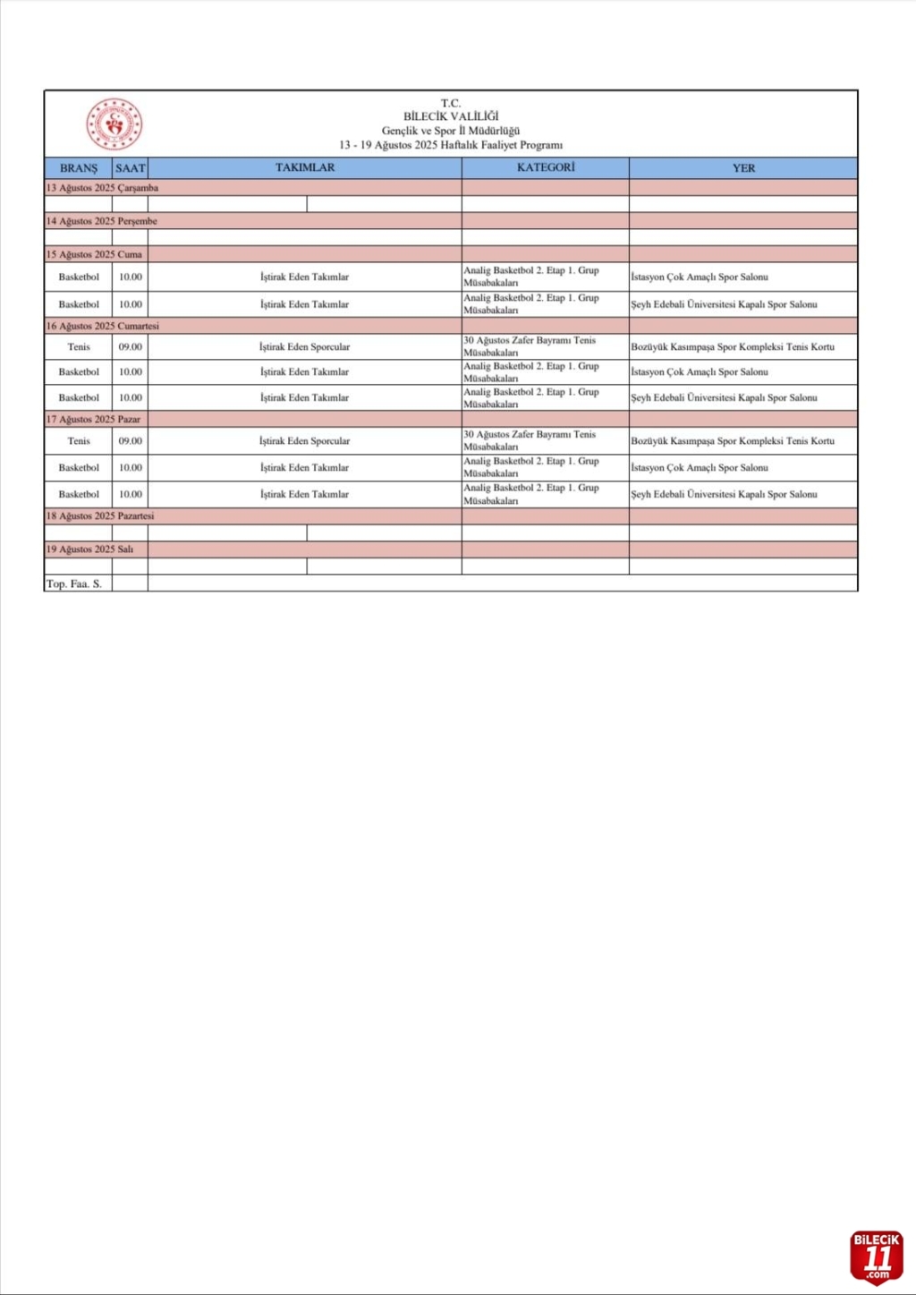 Bilecik Gençlik ve Spor İl Müdürlüğü, 13-19 Ağustos 2025 tarihleri arasındaki etkinlik programını açıkladı.