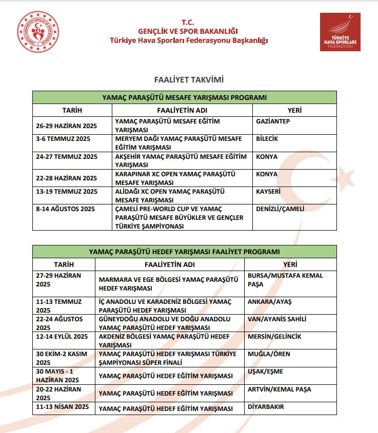 2025 Yılı Yamaç Paraşütü Yarışma ve Eğitim Takvimi
