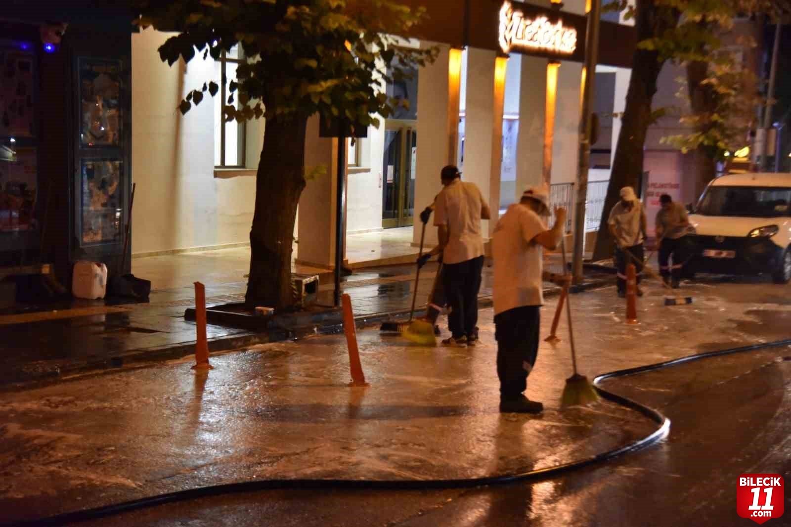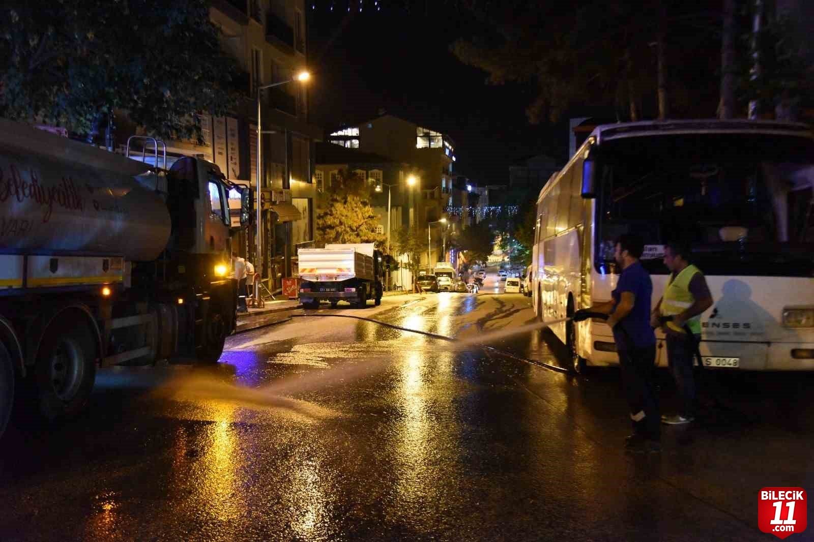 Bilecik’te cadde ve sokakları yıkadı, çöp konteynerlerini dezenfekte etti