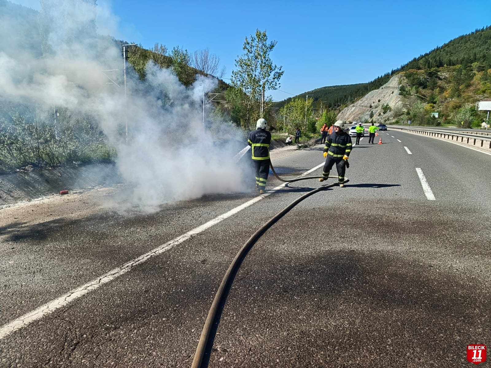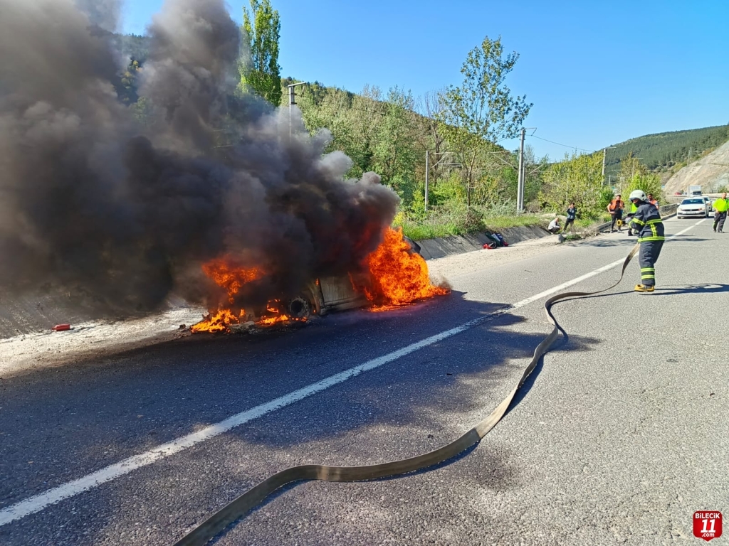 Metin Çabuk yönetimindeki 34 DAG 891 plakalı otomobil, Bilecik-Bozüyük kara yolunun Şelale Rampaları mevkisinde belirlenemeyen nedenle yanmaya başladı.