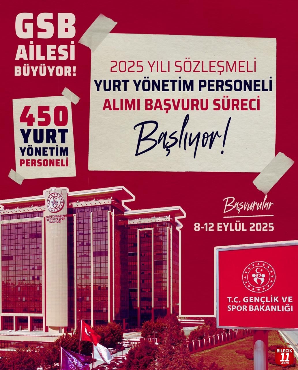 Bilecik Gençlik ve Spor İl Müdürlüğü’nden yapılan açıklamaya göre, Gençlik ve Spor Bakanlığı (GSB) yurt müdürlüklerinde görevlendirilmek üzere 450 sözleşmeli Yurt Yönetim Personeli alımı gerçekleştirecek.