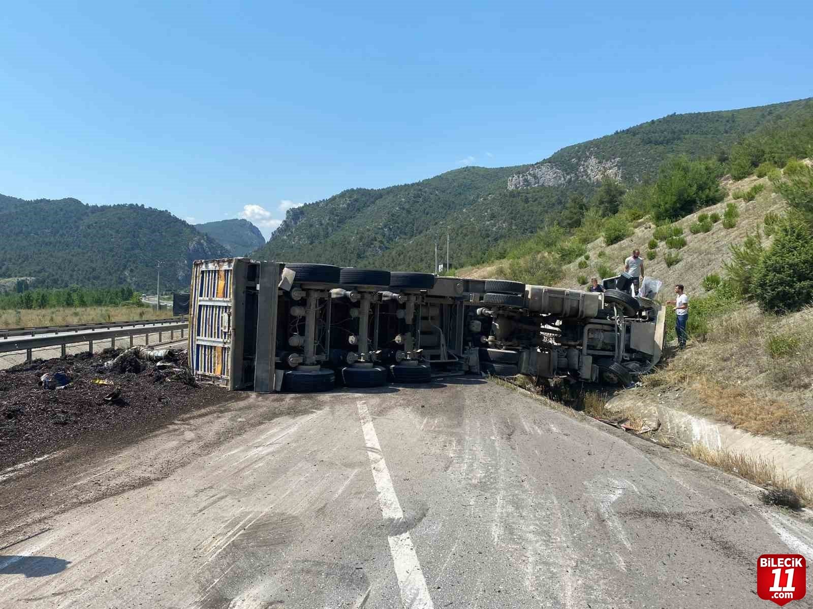 Bilecik’te seyir halindeki hurda yüklü tır kontrolden çıkarak devrilirken, Bilecik-Eskişehir kara yolu yaklaşık bir saat trafiğe kapandı, 3 kilometre araç kuyruğu oluştu.