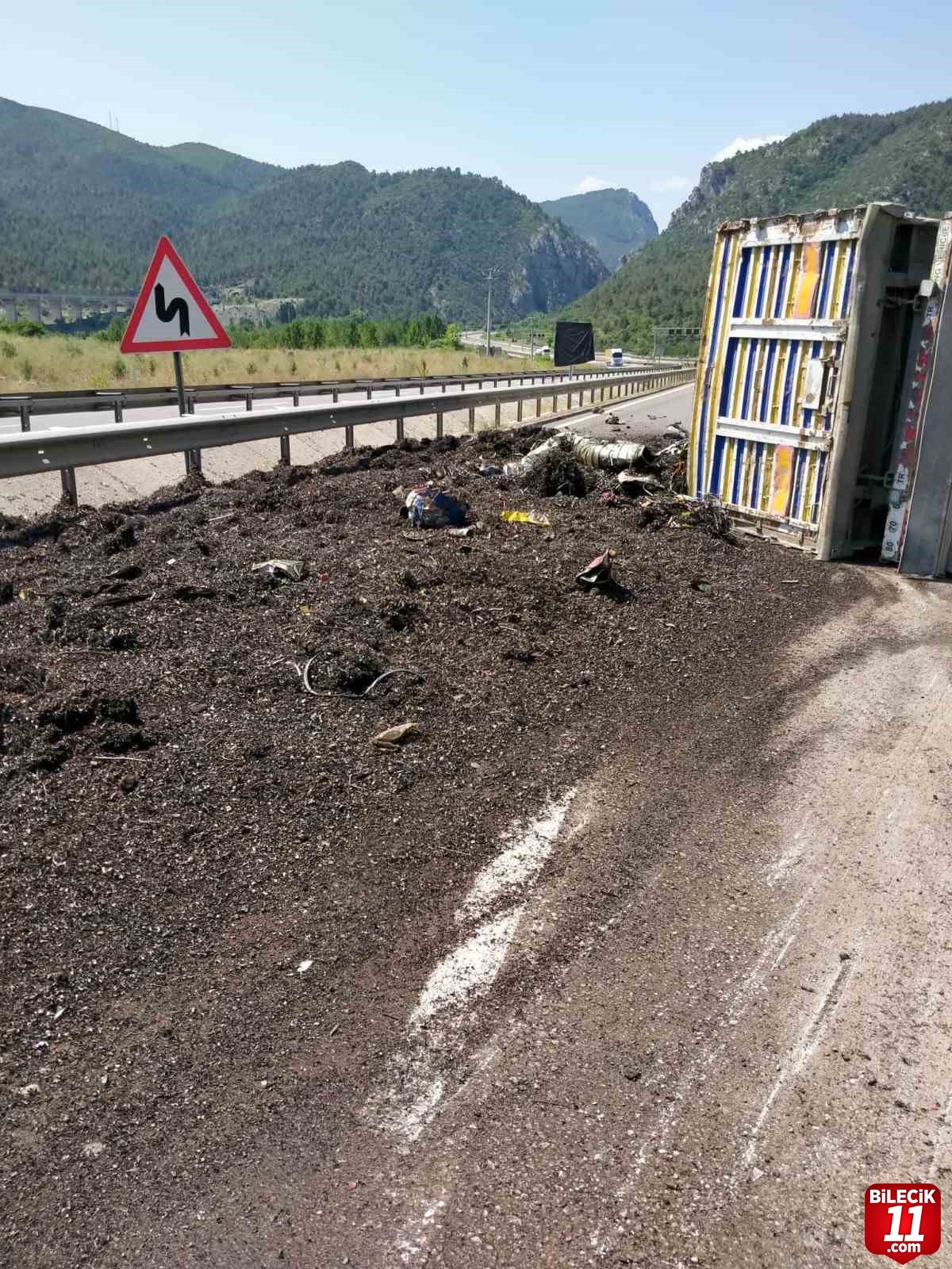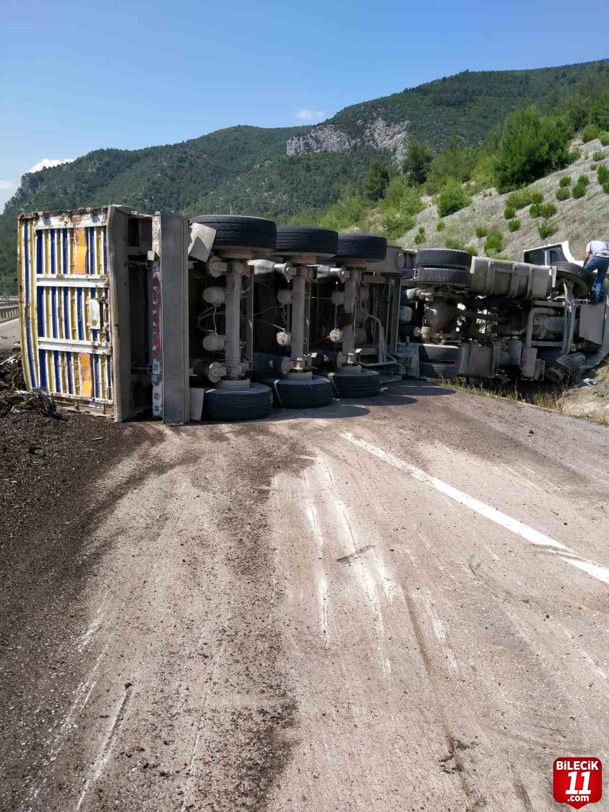 Alınan bilgilere göre; Bilecik’te Eskişehir istikametine seyir halinde olan Mehmet Kara (42) yönetimindeki 11 AAT 612 plakalı hurda yüklü tır, Ertuğrulgazi Tüneli’ne gelmeden sürücünün direksiyon hakimiyetini kaybetmesi sonucu kontrolden çıkarak orta refüje çarpıp yola devrildi.
