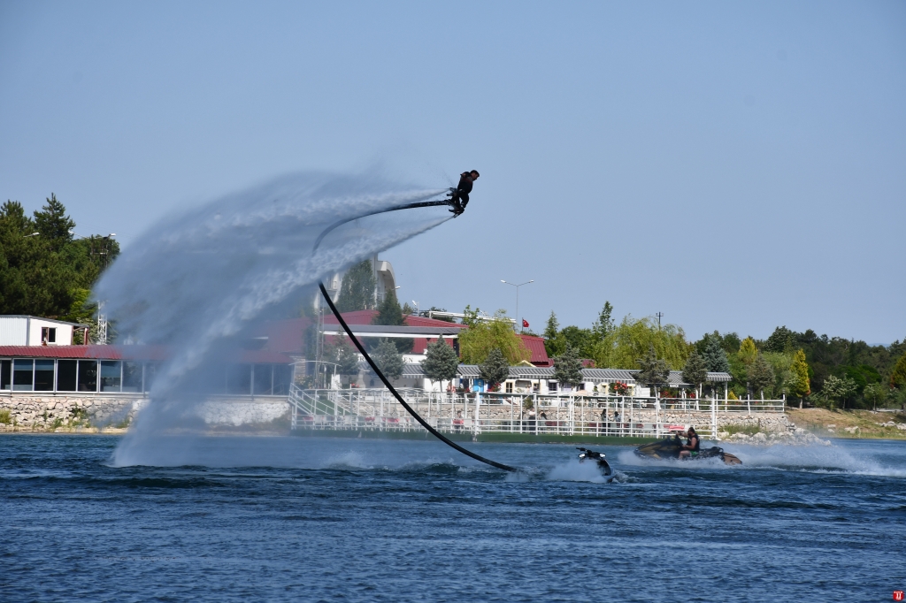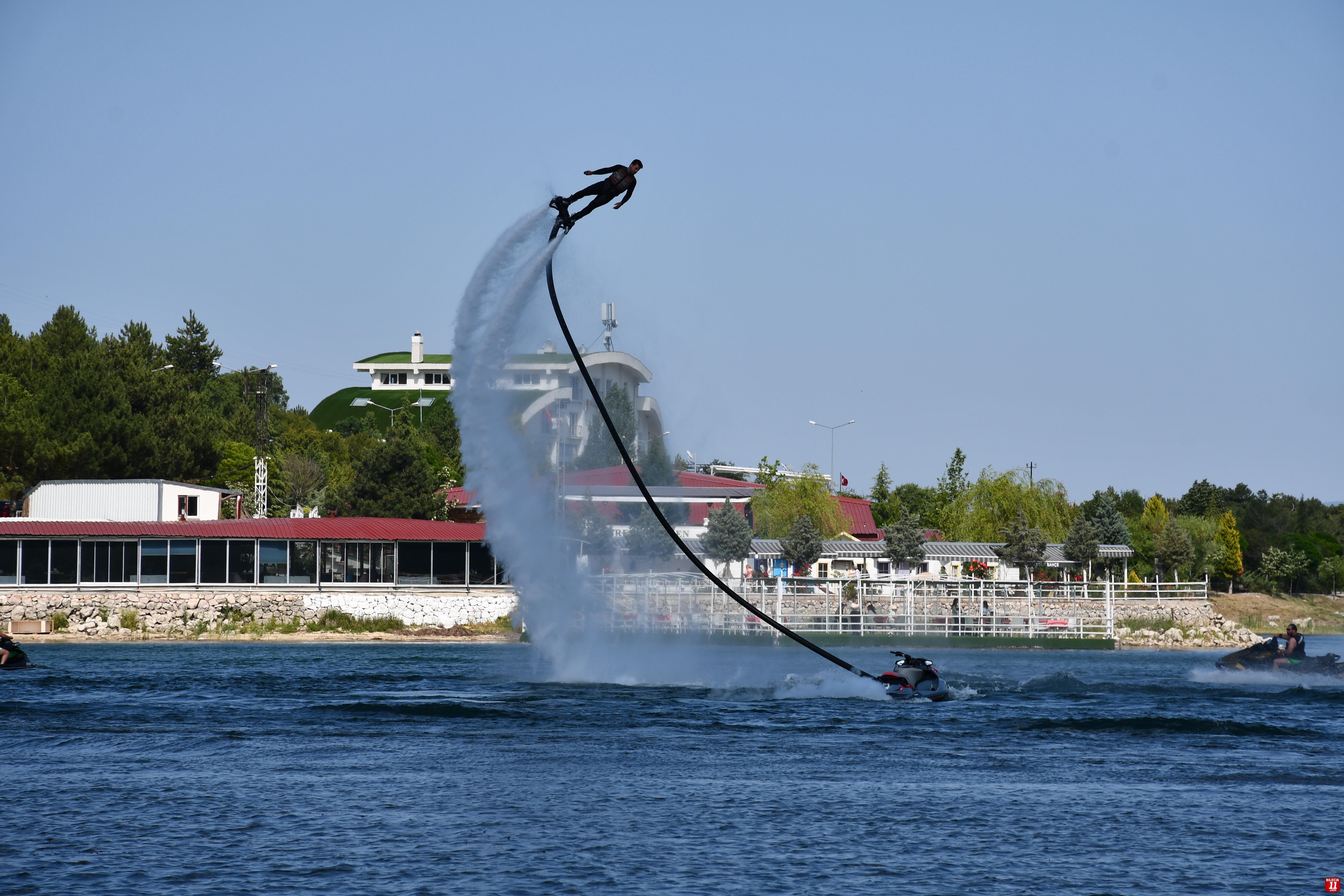 Bilecik’te bu yıl 2’ncisi düzenlenen “Gölpark Fest” kapsamında su üzerinde flyboard gösterisi gerçekleştirildi.