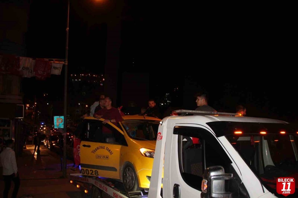 Bir ticari taksiyi çekici üstüne yüklenirken içindekiler seçim sevincini böyle yaşadı. – İHA
