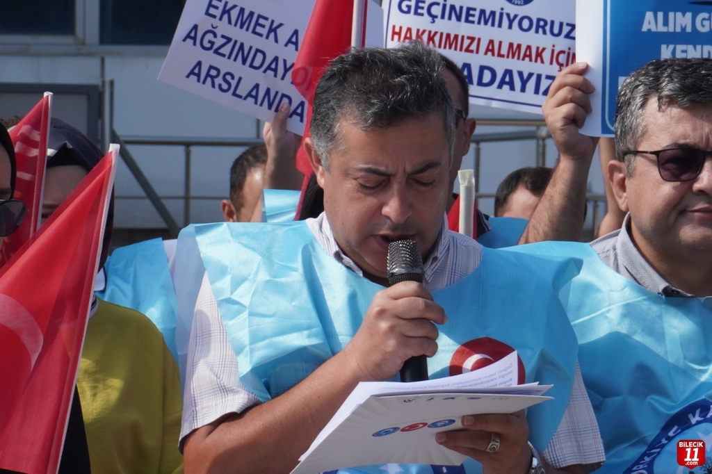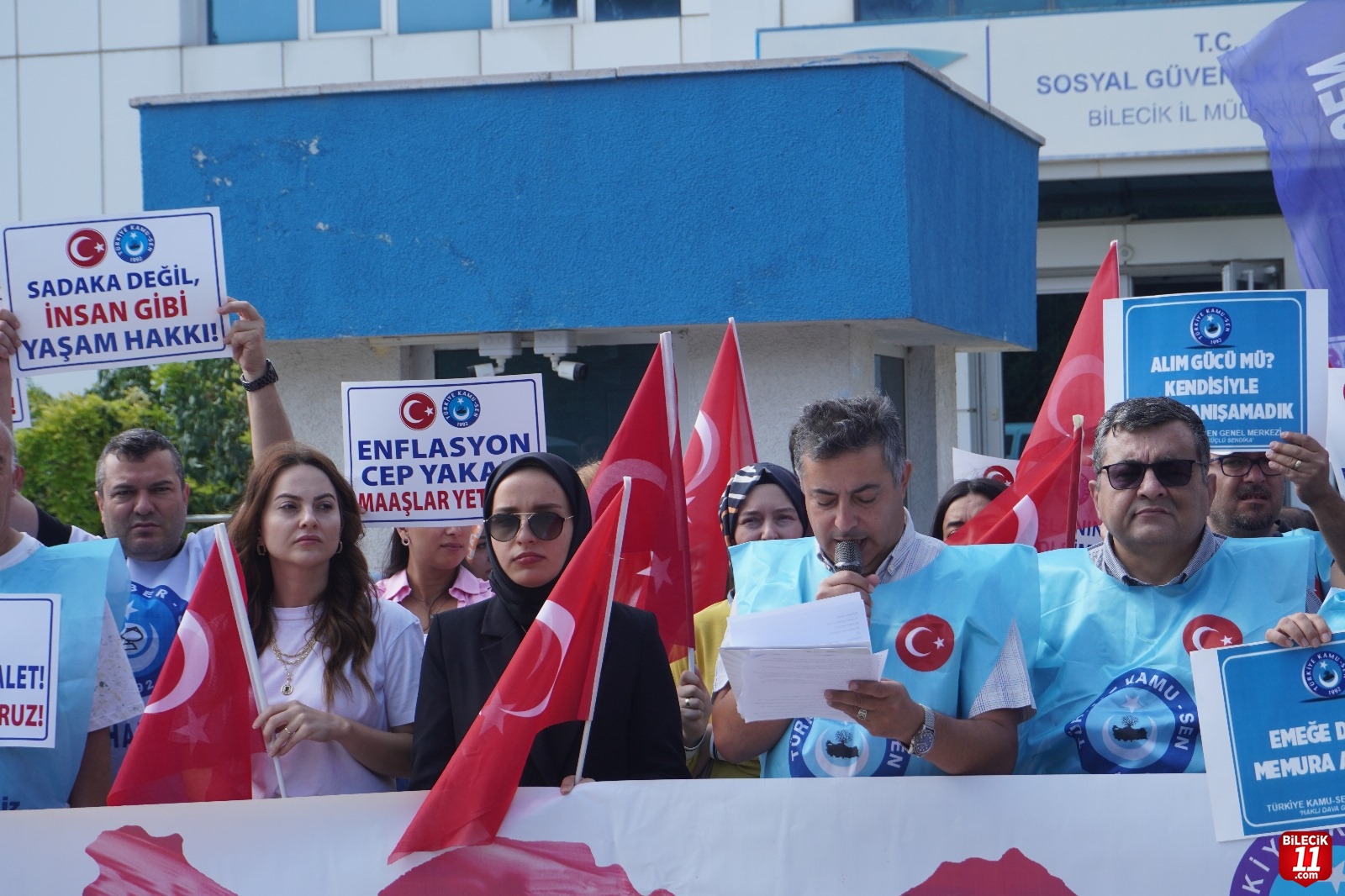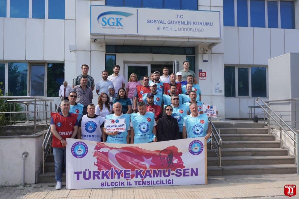 ) Türkiye Kamu-Sen üyeleri Bilecik’te iş bırakma eylemi gerçekleştirdi. Bilecik Sosyal Güvenlik Kurumu (SGK) binası önünde toplanan kalabalık adına açıklama yapan Türkiye Kamu Sen Bilecik İl Başkanı Ali Osman Enli, “Harcamalar katmer katmer artarken, maaşlar dirhem dirhem bile artmıyor.” dedi.