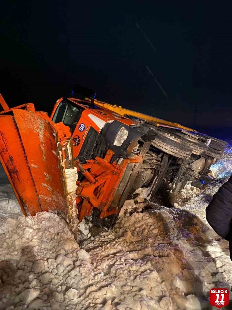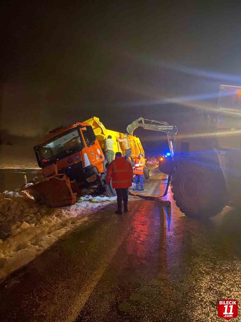 Bilecik’in Pazaryeri ilçesinde karayolunda kar kürüme ve tuzlama yapan kamyon devrildi.