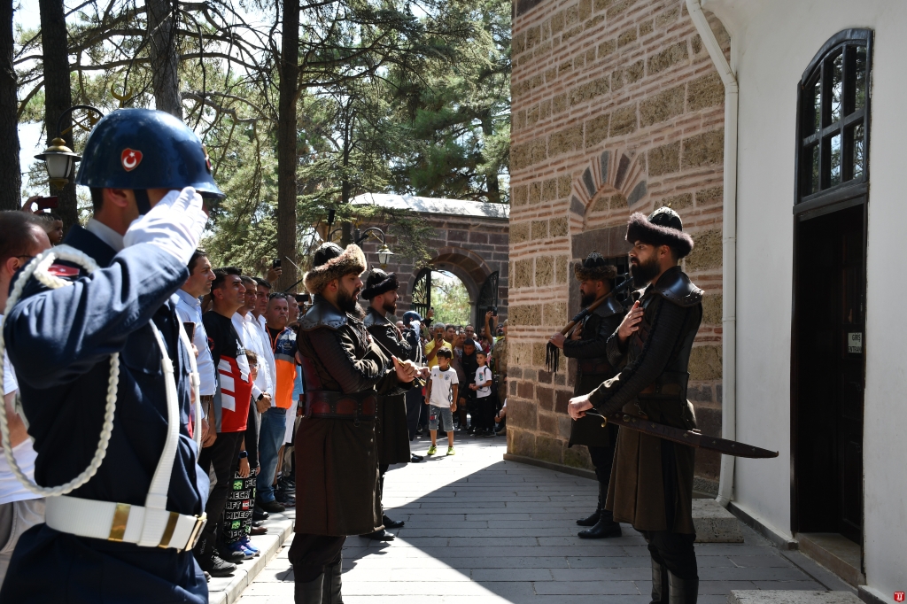 Saygı duruşunda bulunulması ve İstiklal Marşı’nın okunmasının ardından katılımcılar türbeye ziyarette bulundu, alp kıyafeti giymiş jandarma personelinin saygı nöbeti değişimini izledi.