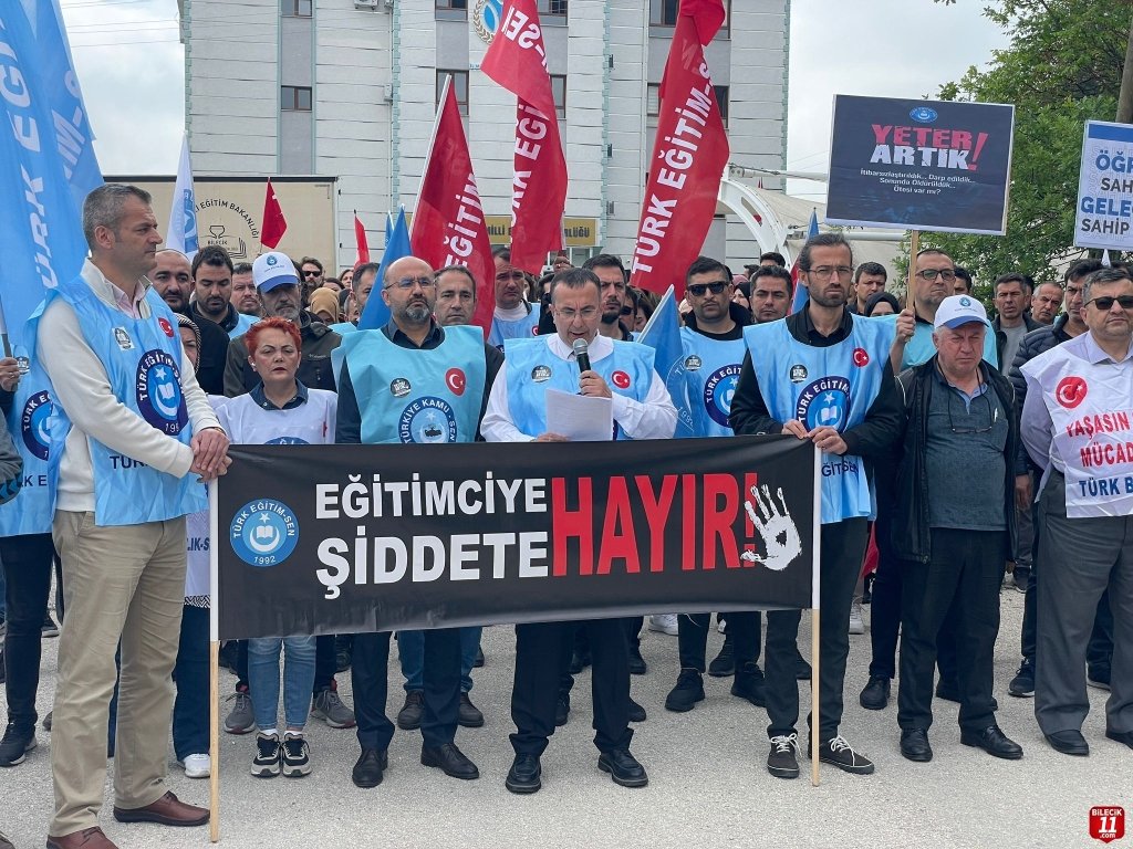 Türk Eğitim Sen Bilecik Şube Başkanı Veli Şahan, İl Milli Eğitim Müdürlüğü önünde yaptığı basın açıklamasında, birçok okulda güvenlik görevlisinin bulunmadığını vurgularken, “her okulumuza güvenlik görevlisi alımı yapılması ve okullarımızın tamamında kamera bulundurulması hayati bir zorunluluktur” dedi.