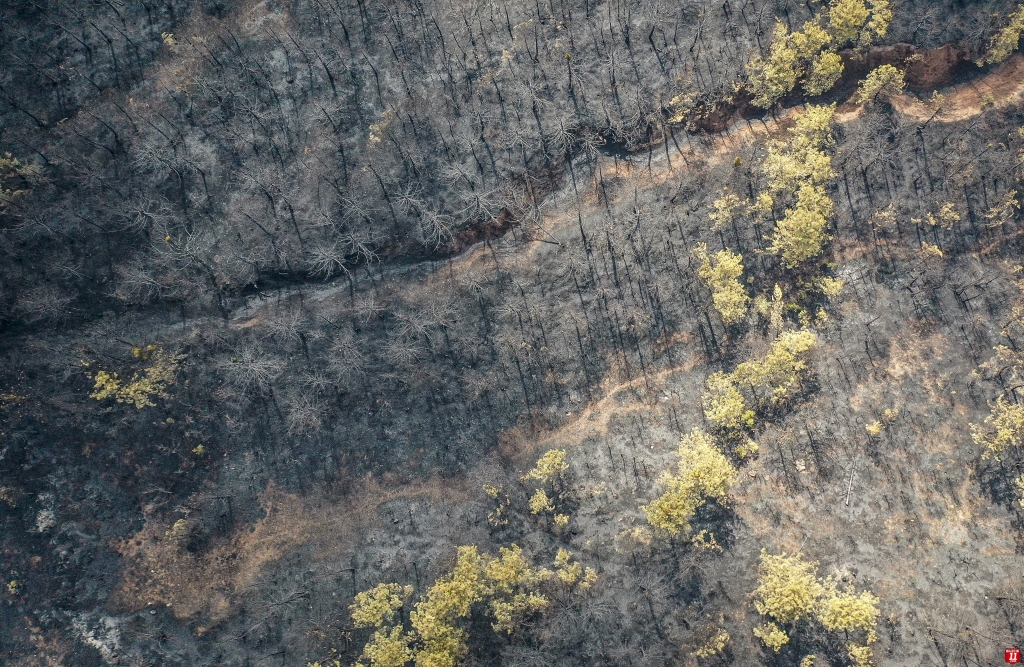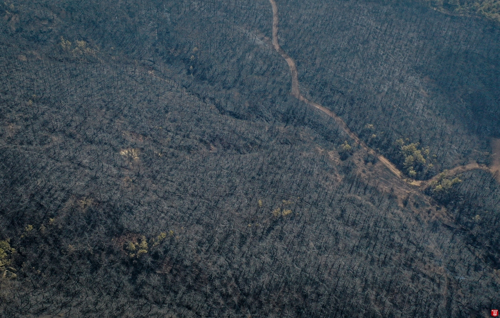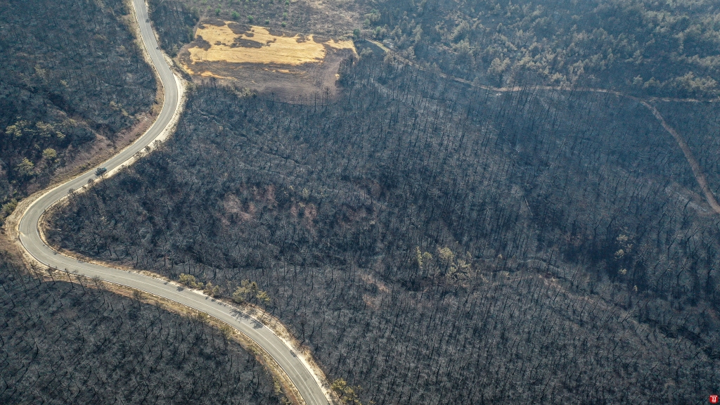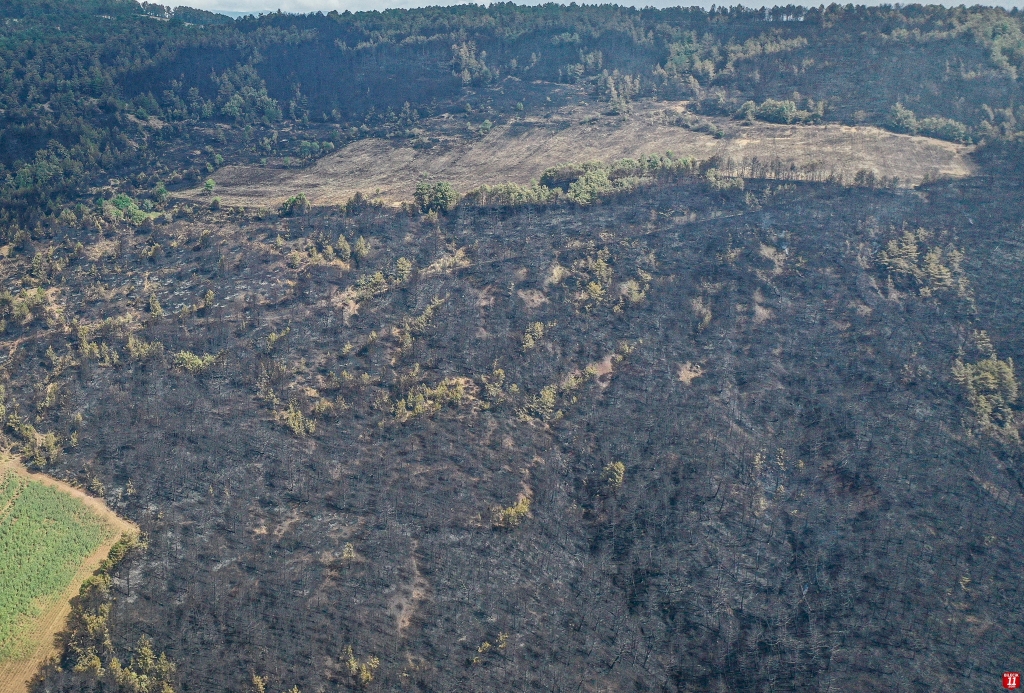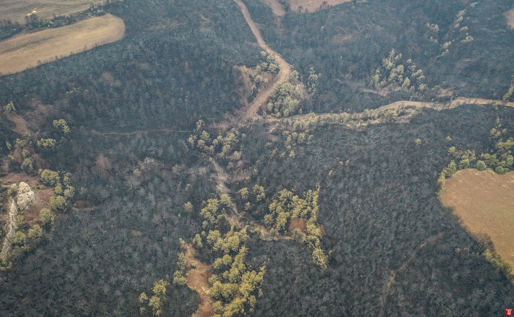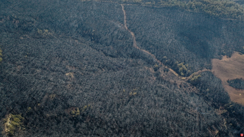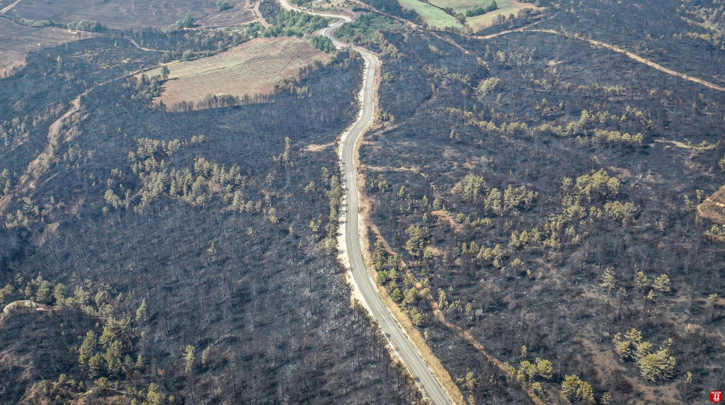 Yangında zarar gören alan dronla görüntülendi. Görüntülerde, ormanlık alanın alevler nedeniyle siyaha bürünmesi yer aldı.