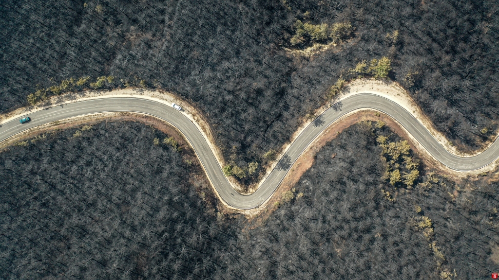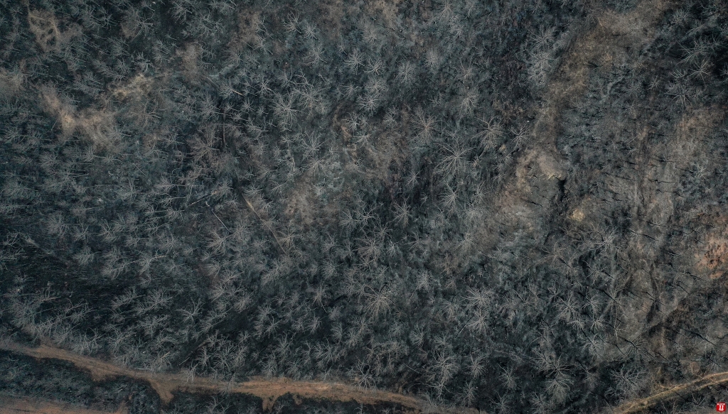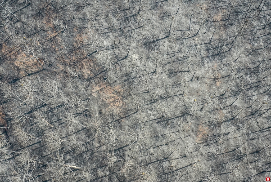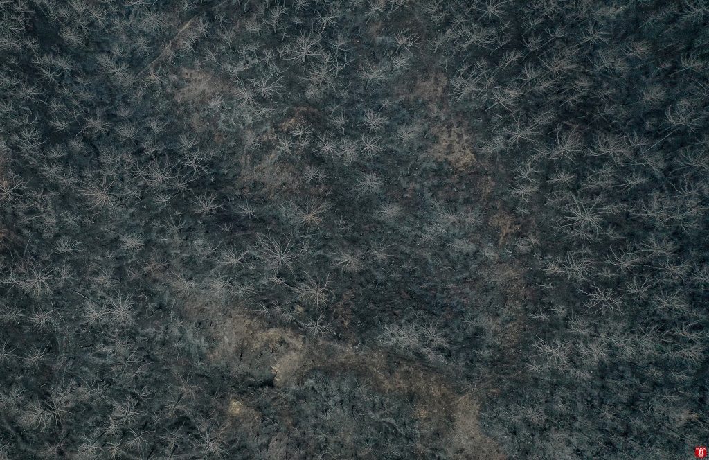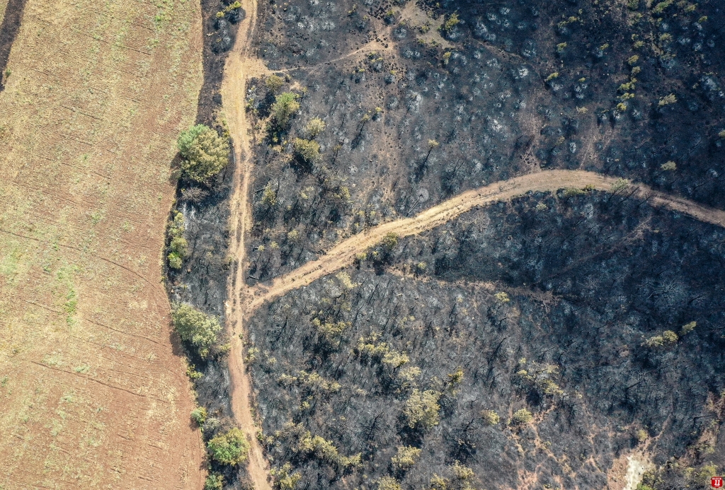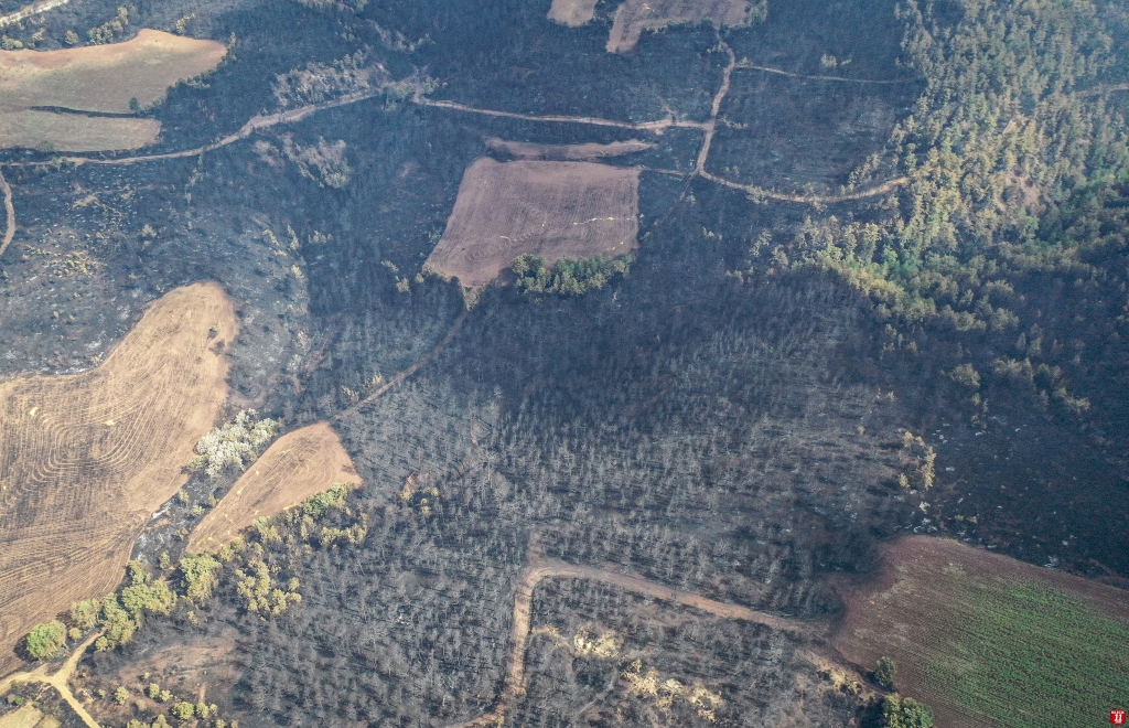 Yangında zarar gören alan dronla görüntülendi. Görüntülerde, ormanlık alanın alevler nedeniyle siyaha bürünmesi yer aldı.