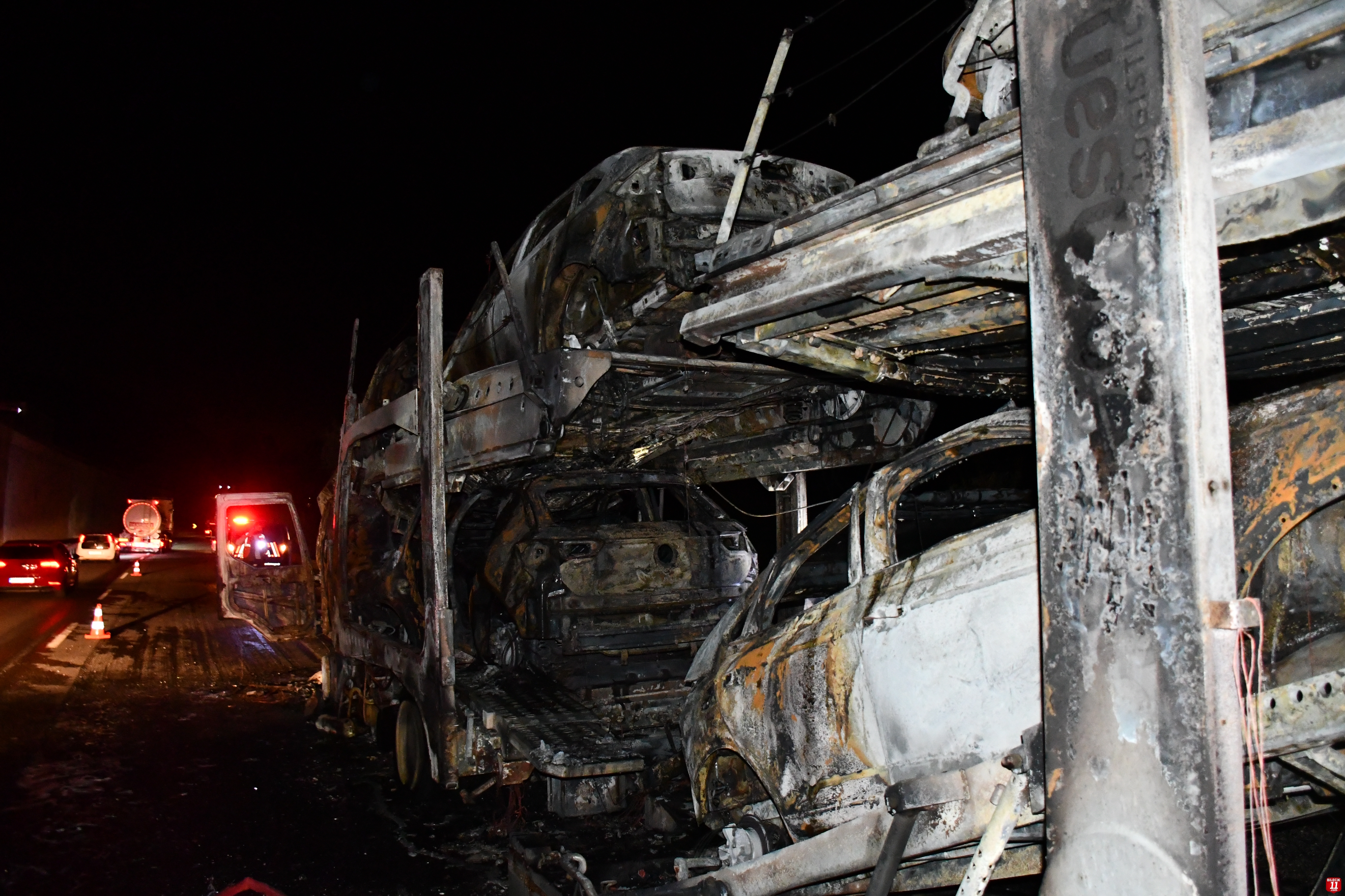 Ekiplerce söndürülen tır ile taşıdığı otomobiller kullanılamaz hale geldi.