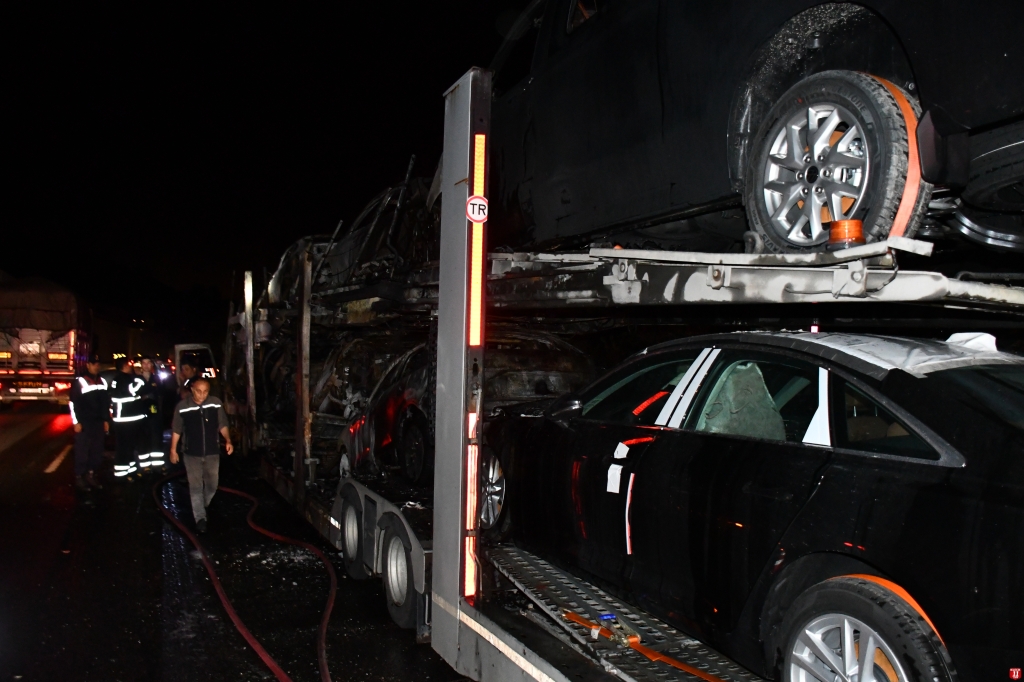 Bilecik’te, seyir halindeyken alev alan otomobil yüklü tır ve taşıdığı araçlar kullanılamaz hale geldi.