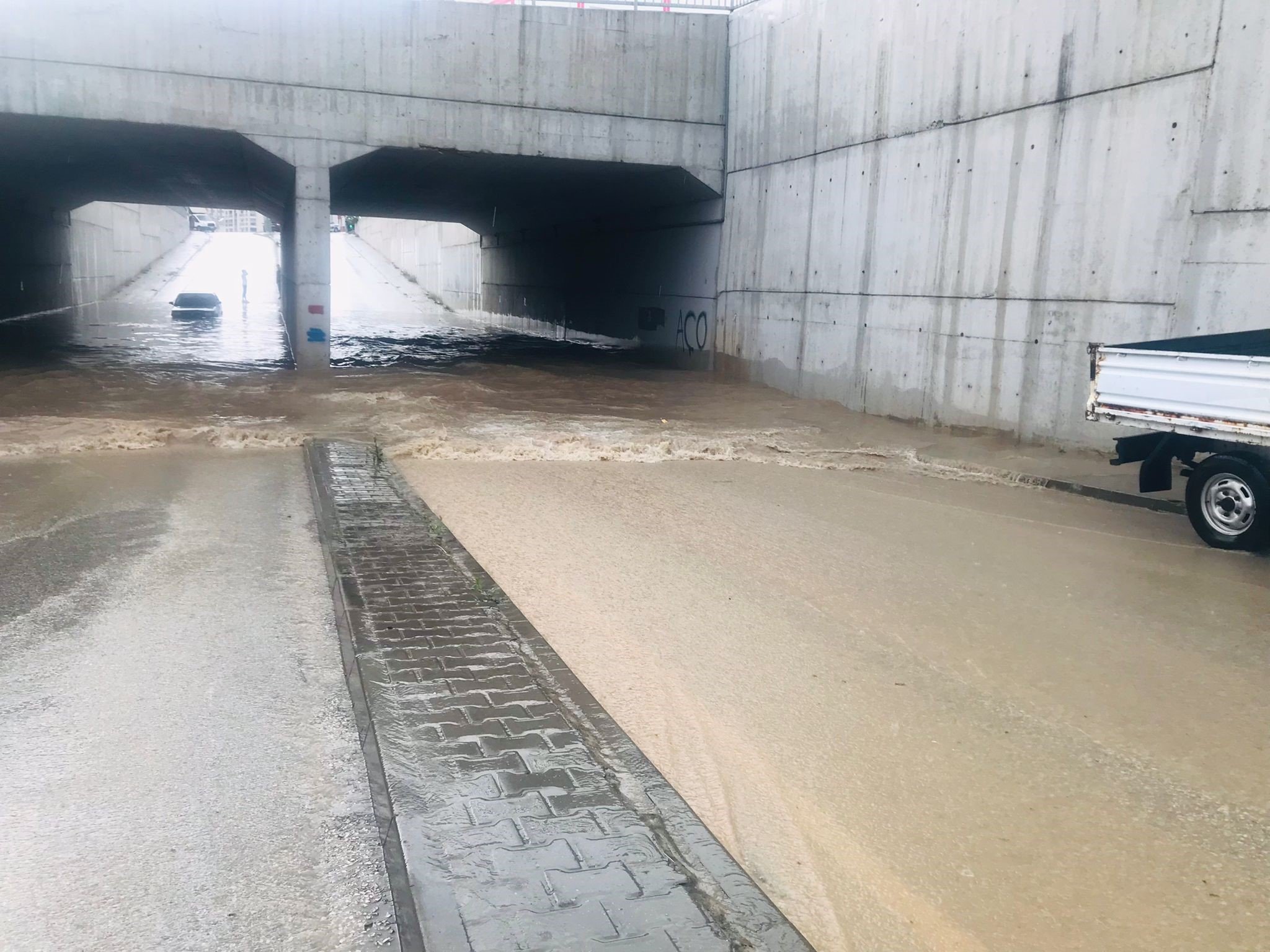 Küçük Sanayi Sitesi alt geçidinde bir araç mahsur kalırken, aracın içindeki vatandaşlar kendilerini zor dışarı attı.