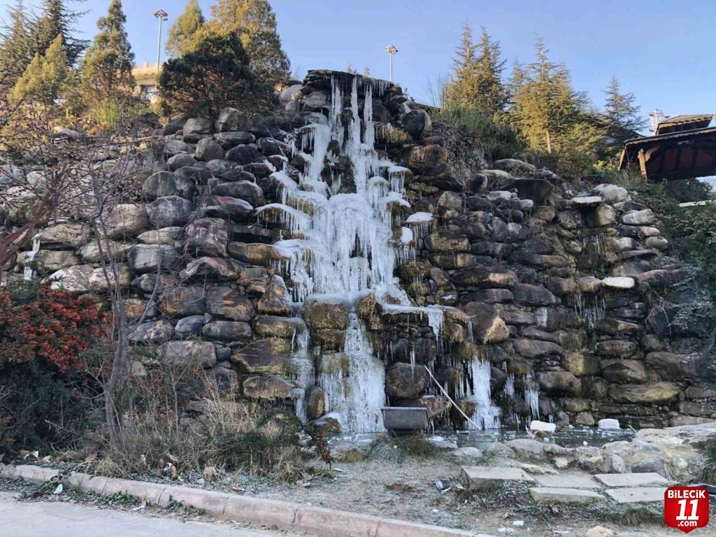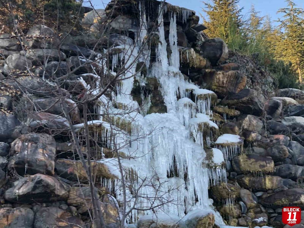 Bilecik Belediyesi tarafından Tebebaşı mevkiine 3 bin metre karelik alan içine kurulu doğal taşlardan yapılan süs şelalesi hava sıcaklığını gece eksi 5’leri gördüğü şu günlerde dondu.