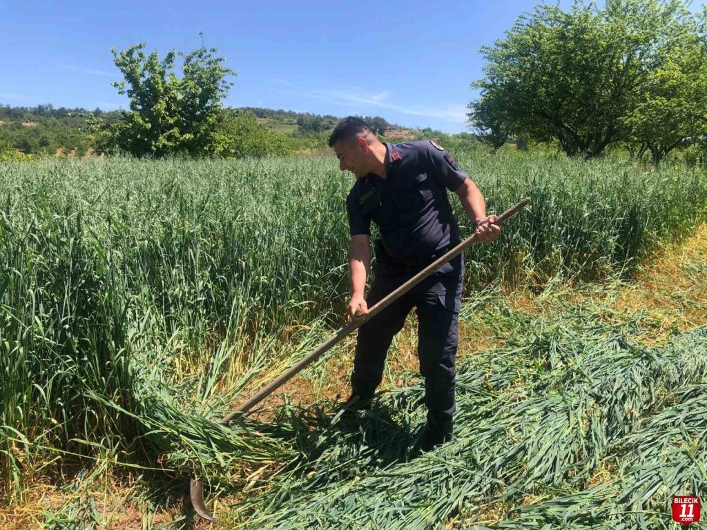 Bilecik’te tarlasında yulaf biçen çiftçi Ömer Seral’ın yorgunluğu gören jandarma eline tırpanı alarak yardım etti.