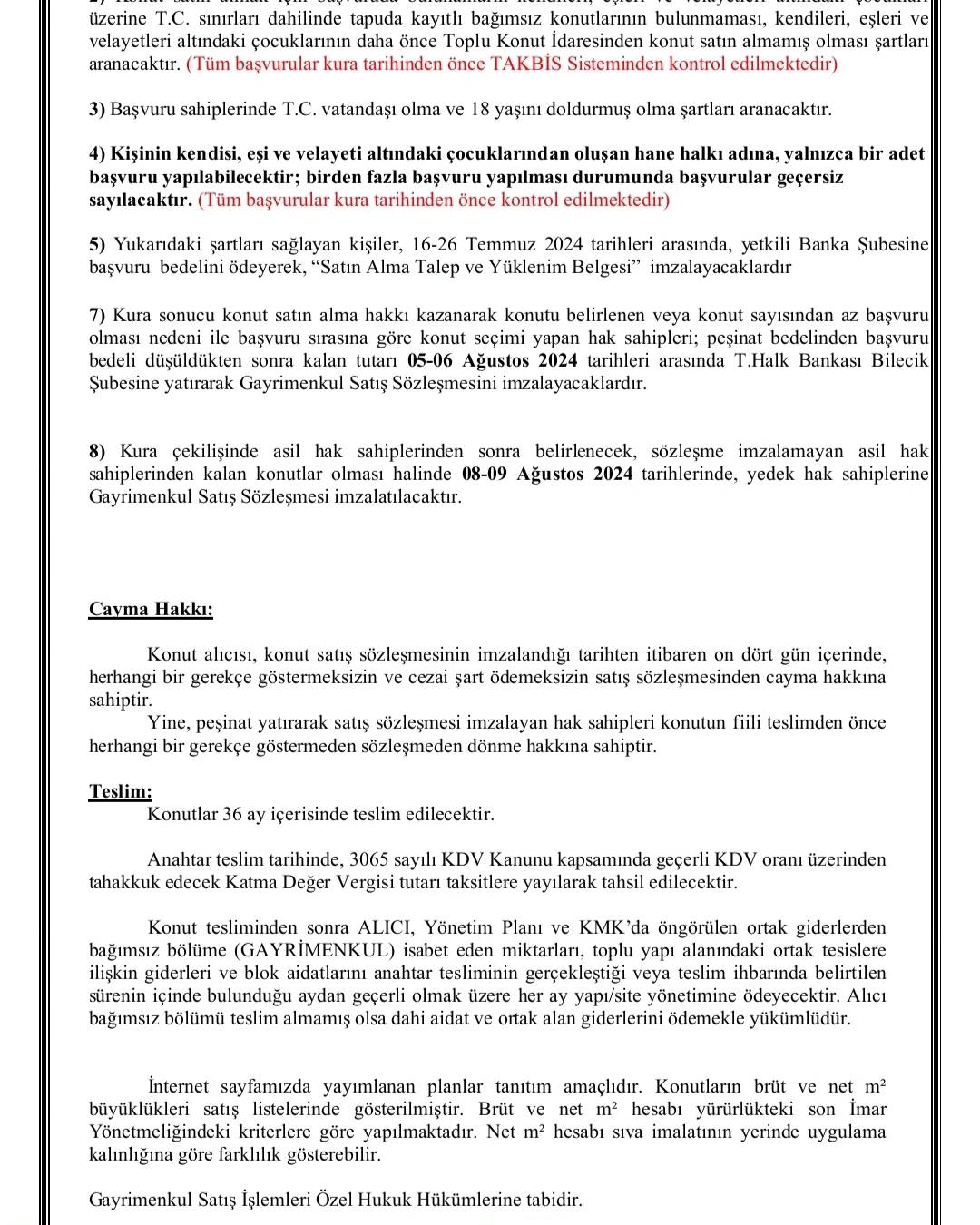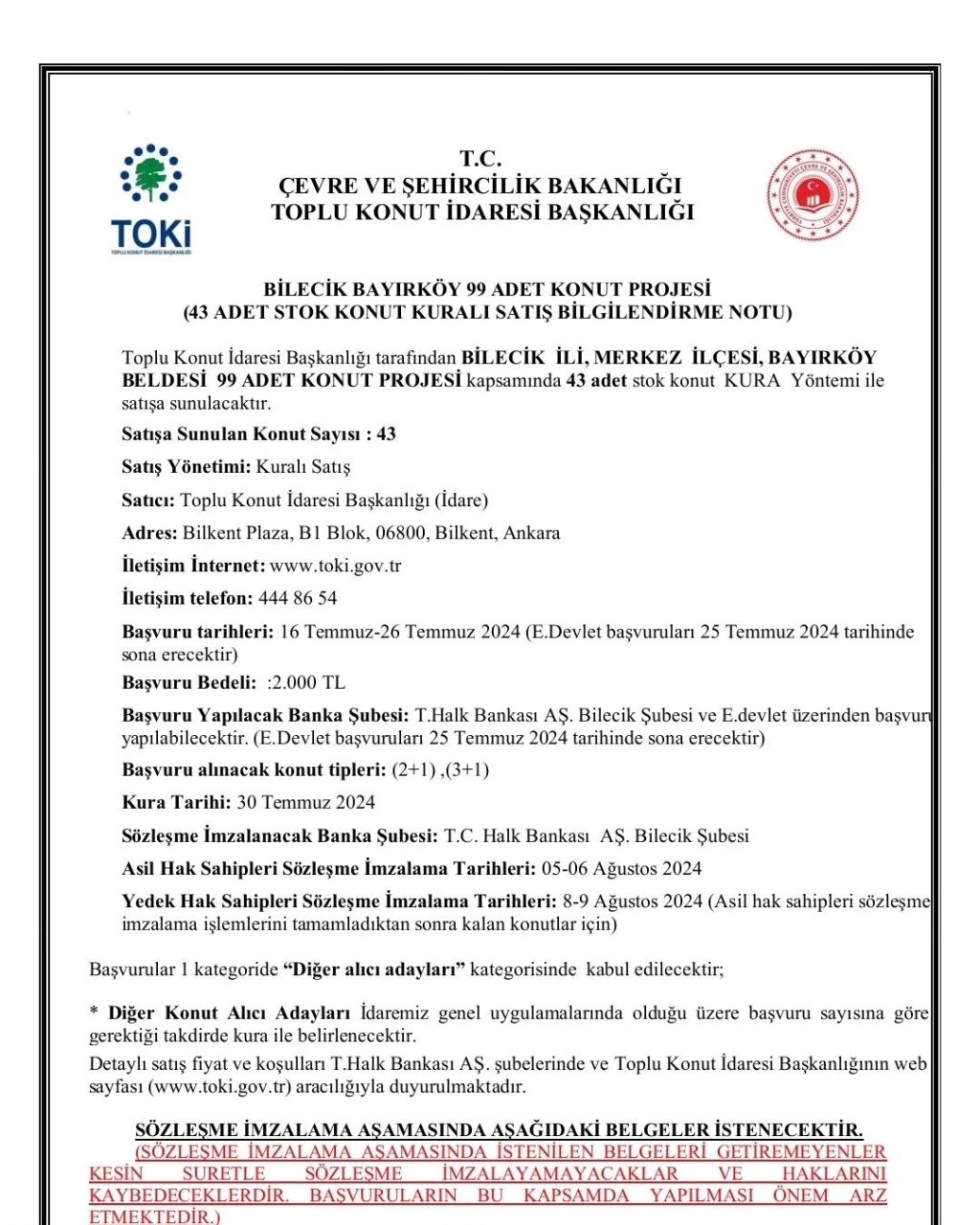“TOKİ ,Toplu Konut İdaresi Başkanlığı tarafından beldemizde yapılan 99 adet Sosyal konuttan 43 adeti için, 16 Temmuz – 25 Temmuz tarihleri arasında başvuru alınmaya başlanacaktır, Vatandaşlarımız başvurularını e-devlet üzerinden yada Bilecik Halk Bankasından yapabilecek olup, Kuralar 30 Temmuz 2024 tarihinde çekilecektir.”