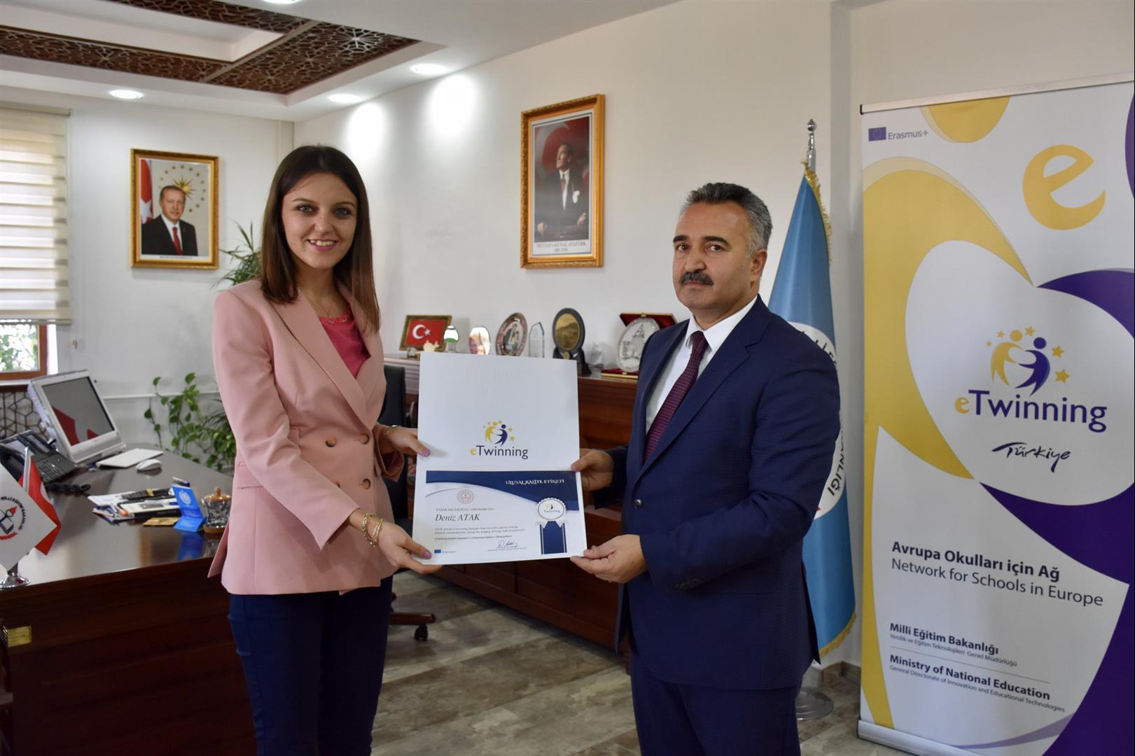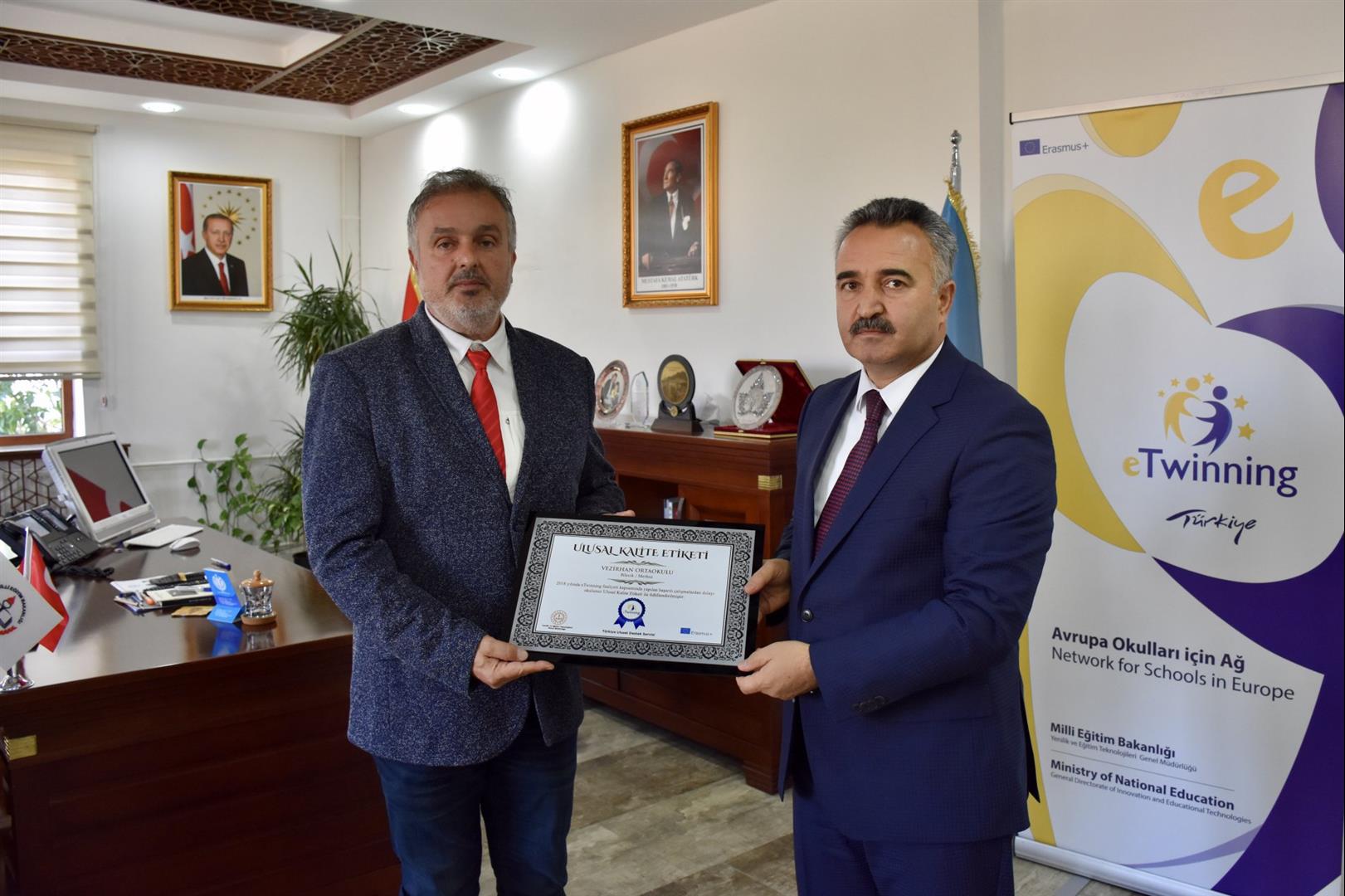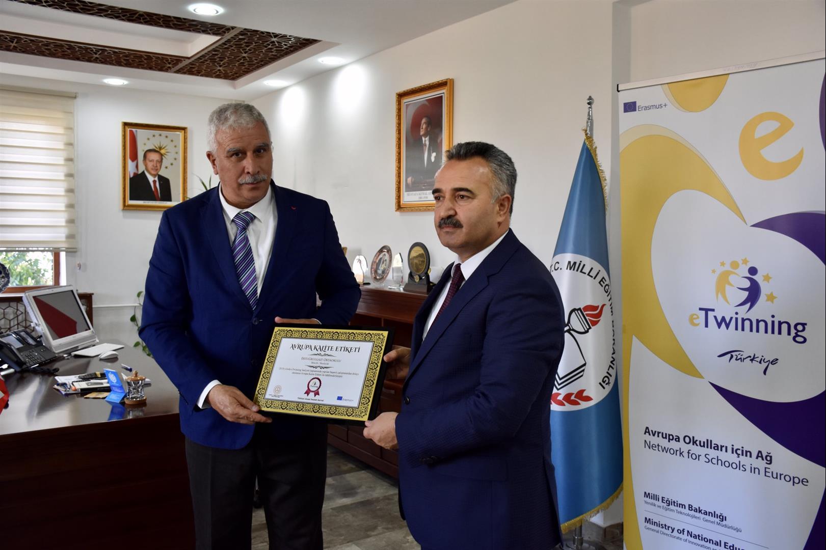 İl Milli Eğitim Müdürü Ramazan Çelik, eTwinning Projesi ile Ulusal ve Avrupa Kalite Etiketi almaya hak kazanan öğretmenlere belgelerini, kalite etiketleri alan öğretmenlerin görev yaptıkları okul müdürlerine de kalite etiketlerinin levhaları düzenlenen törenle verdi.