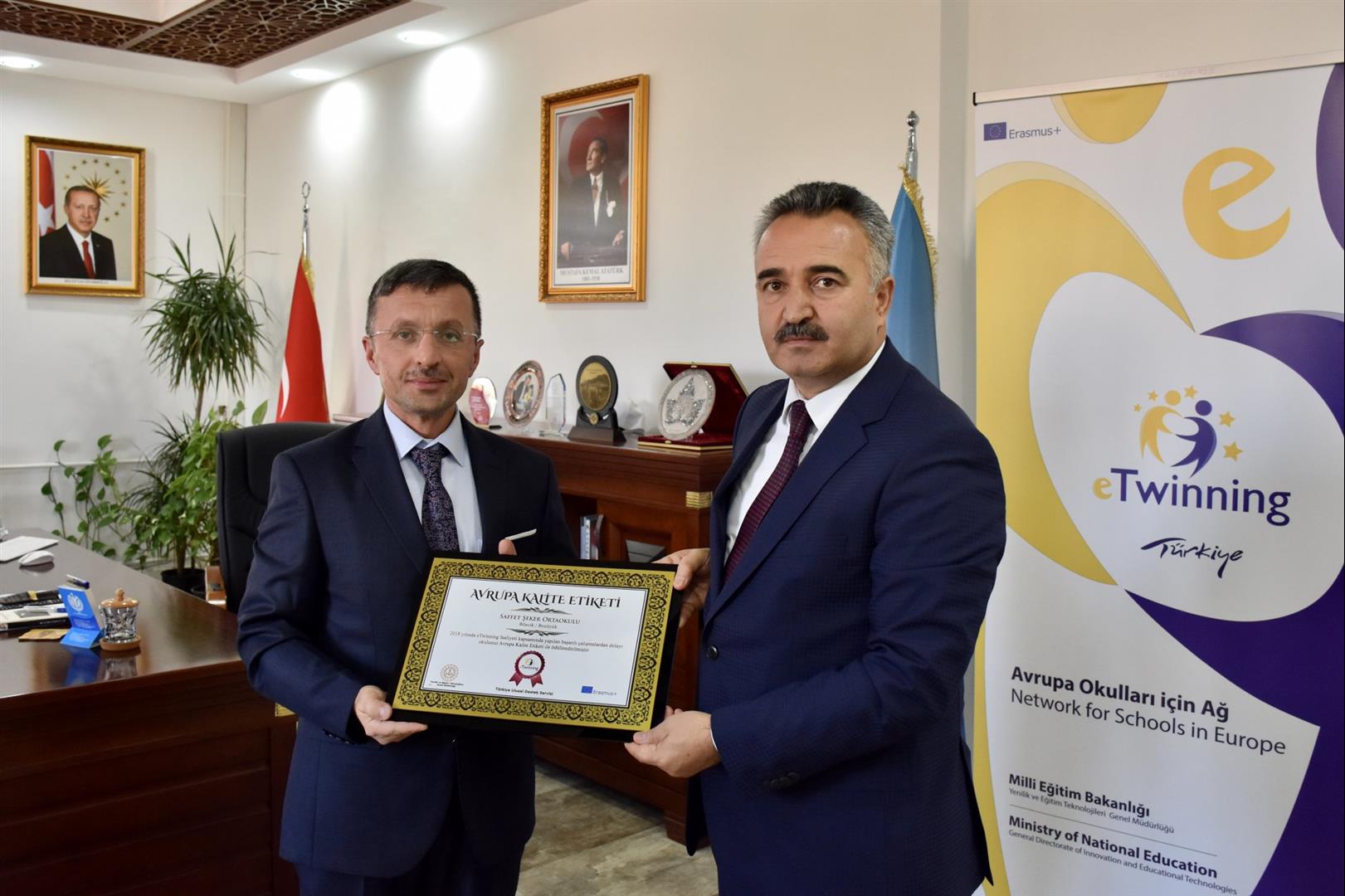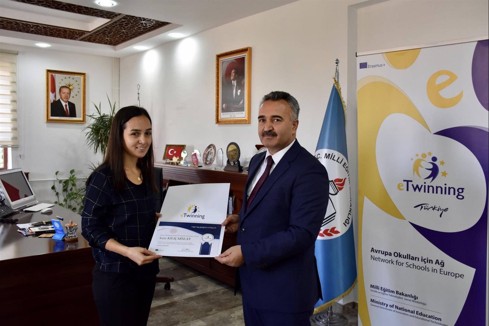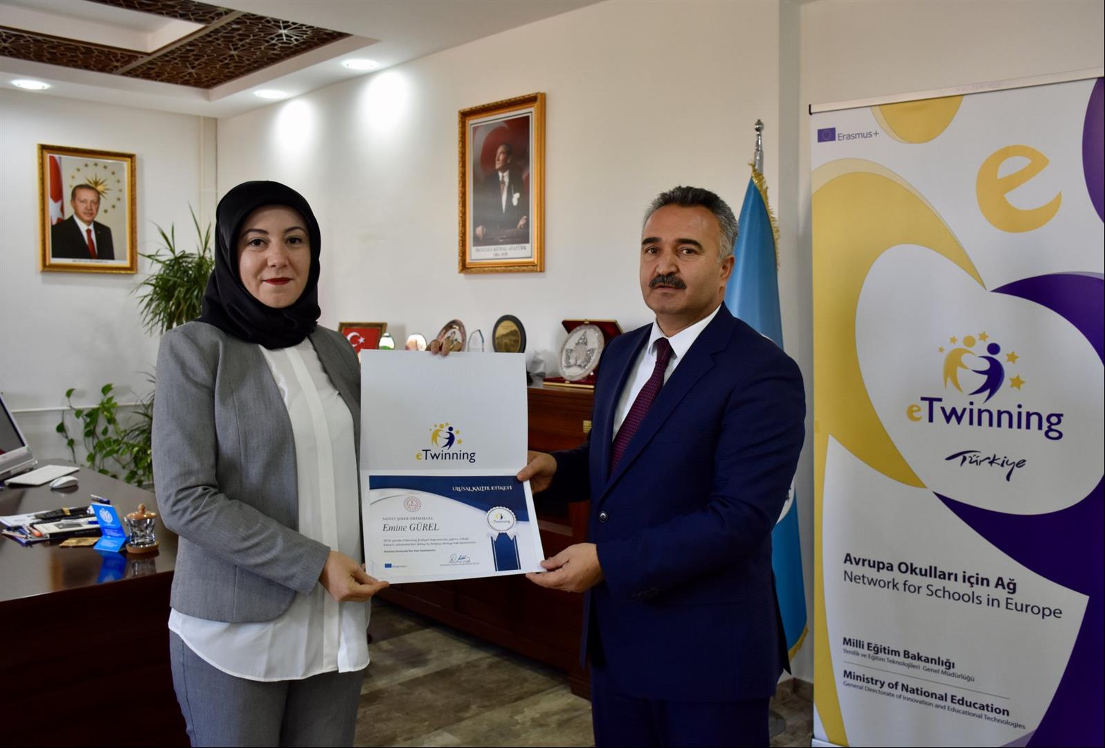 İl Milli Eğitim Müdürü Ramazan Çelik, eTwinning Projesi ile Ulusal ve Avrupa Kalite Etiketi almaya hak kazanan öğretmenlere belgelerini, kalite etiketleri alan öğretmenlerin görev yaptıkları okul müdürlerine de kalite etiketlerinin levhaları düzenlenen törenle verdi.