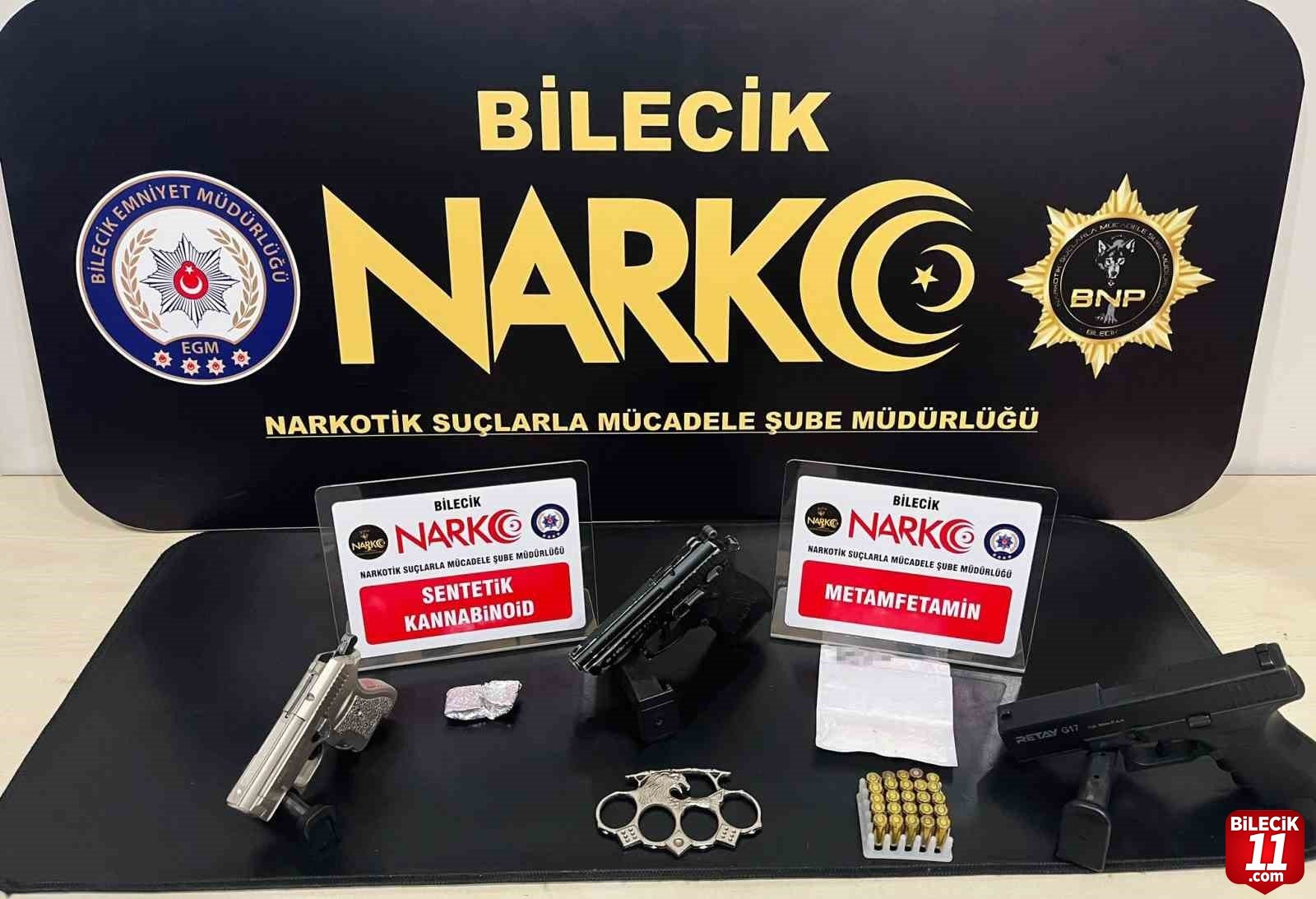 Operasyonda şahısların ikametinde, arabalarında ve kendi üzerlerinde yapılan arama sonucunda 351,84 gram gelen Sentetik Kannabinoid (Bonzai) maddesi, 8,46 gram gelen metamfetamin maddesi, 3 adet tabanca, 25 adet tabanca fişeği, 2 adet bong aparatı ele geçirildi.