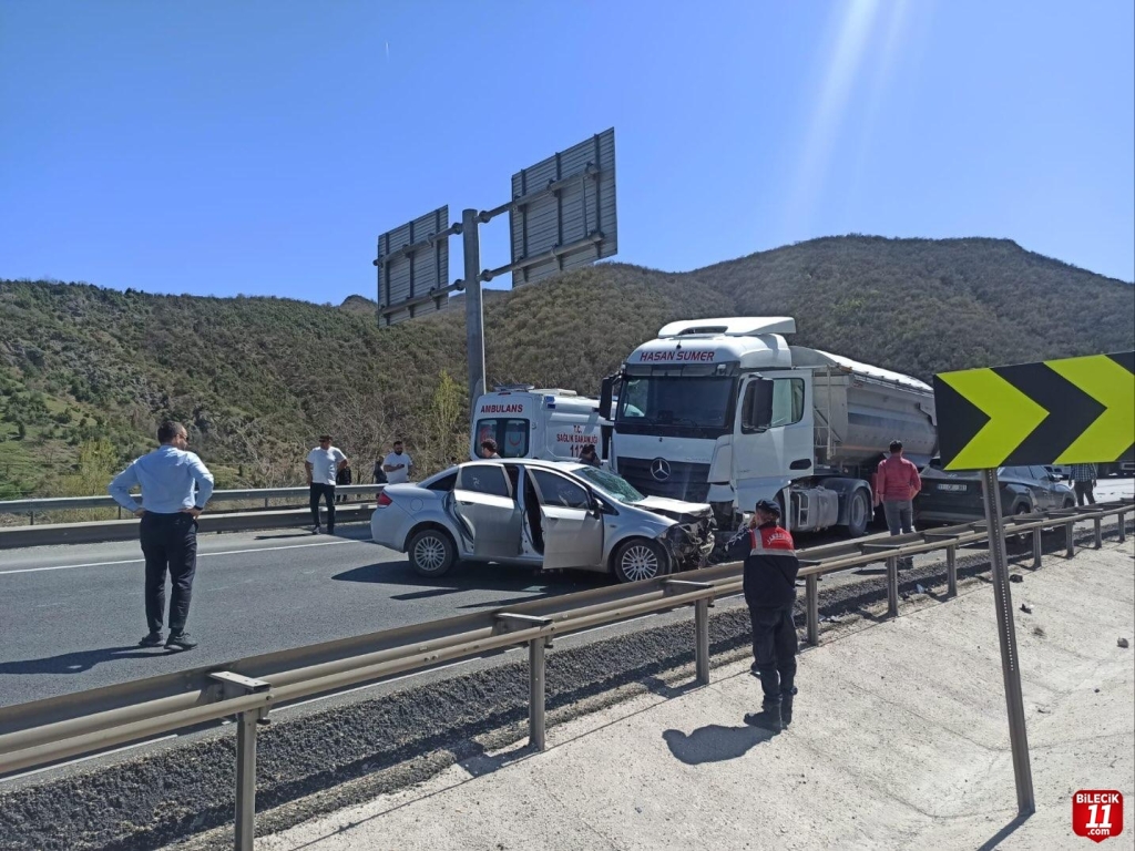 Alınan bilgiye göre, Bilecik-Bozüyük kara yolunda seyreden ve henüz sürücüsünün kimliği öğrenilemeyen 26 HS 721 plakalı tır, Karaköy Kavşağı yakınlarında Hasan B. idaresindeki 11 DE 960 plakalı otomobille çarpıştı.
