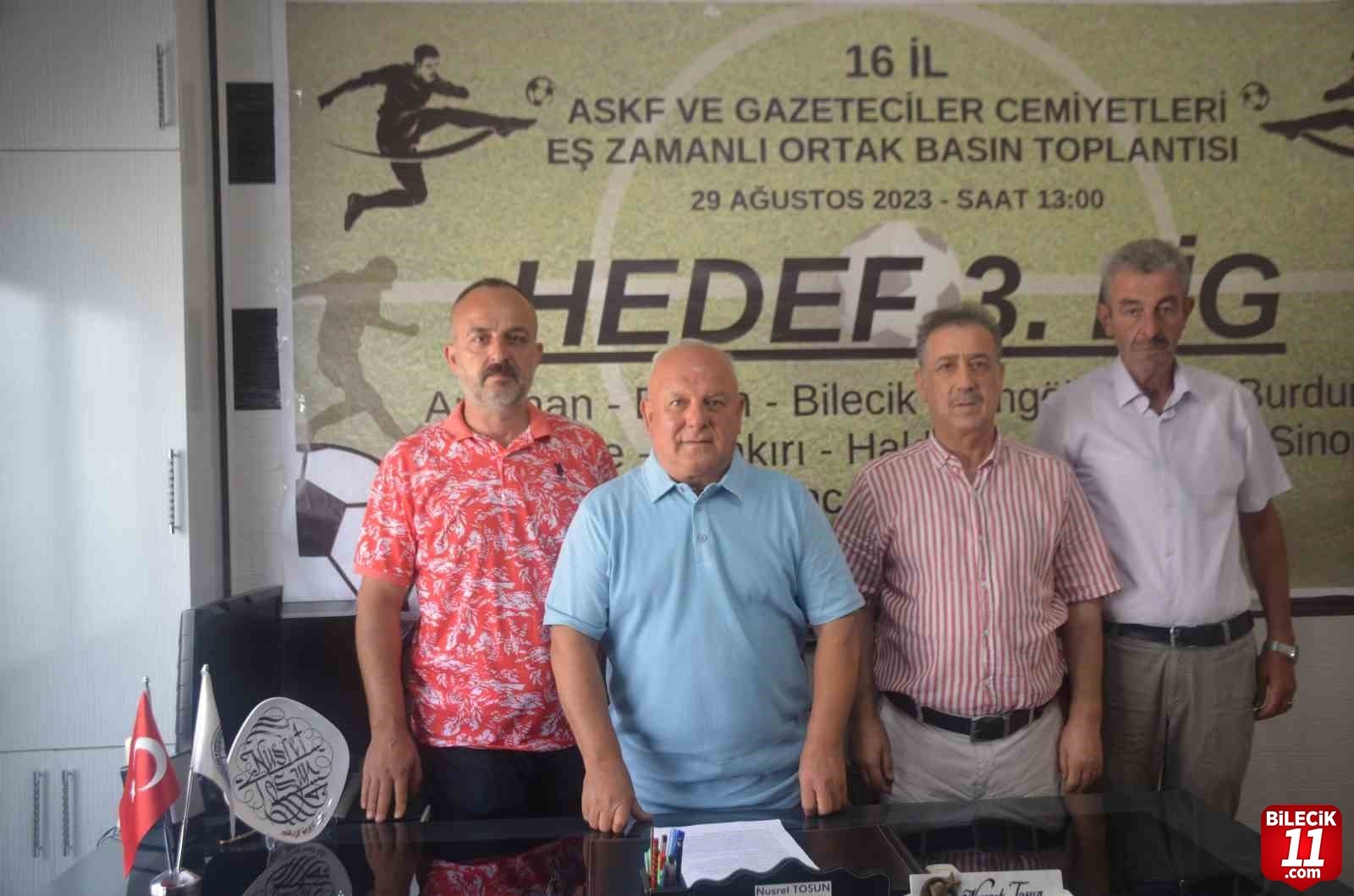 Bilecik Amatör Spor Kulüpleri (ASKF) Başkanı Nusret Tosun, 1969 Bilecik Spor Kulübünün 3’üncü Lig’e alınması için Cumhurbaşkanı Erdoğan’a talep ederek, “16 ilimizde de ASKF başkanları aynı basın metni ile basın mensuplarımızın karşısında bulunmaktadır” dedi.
