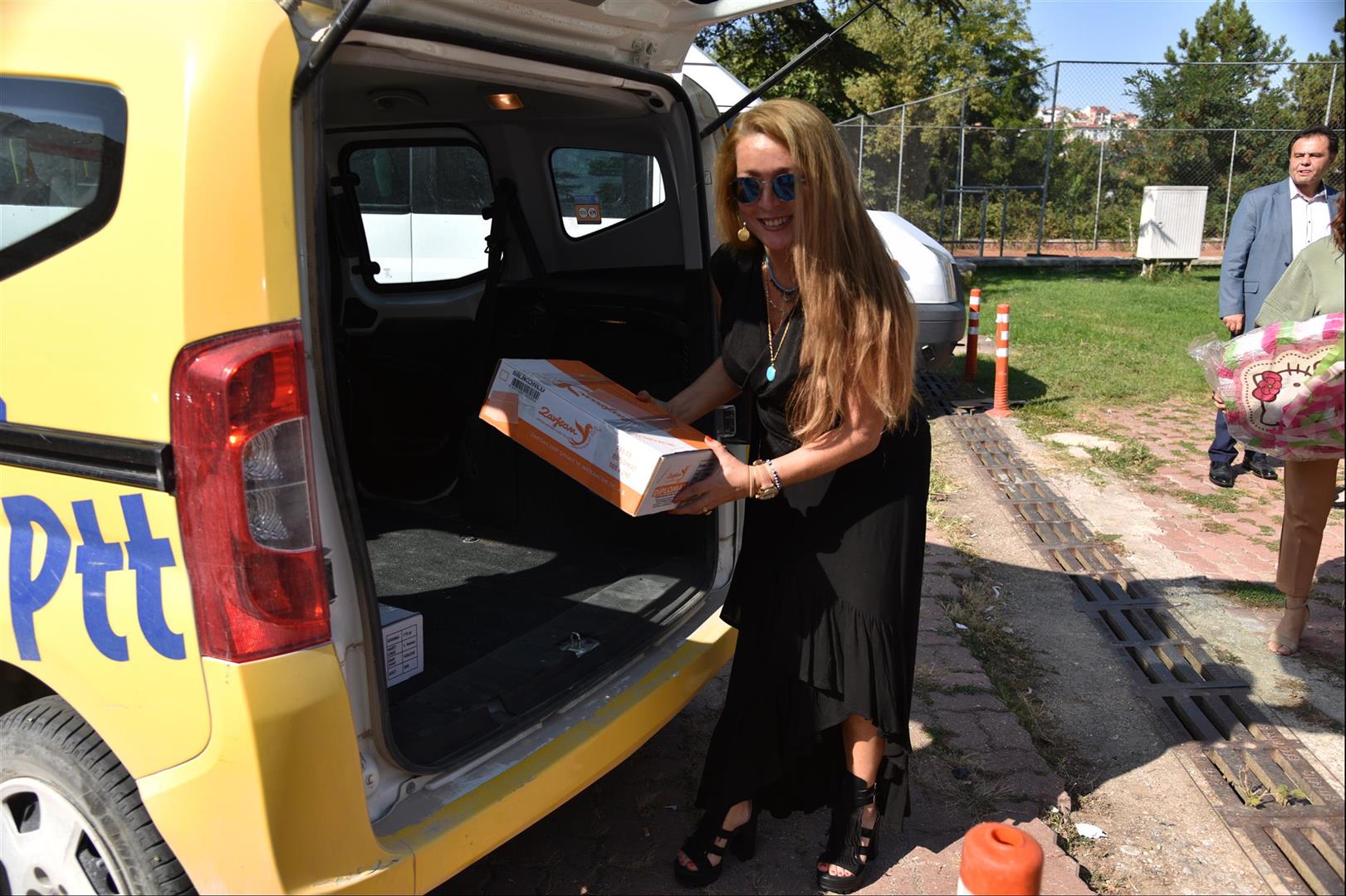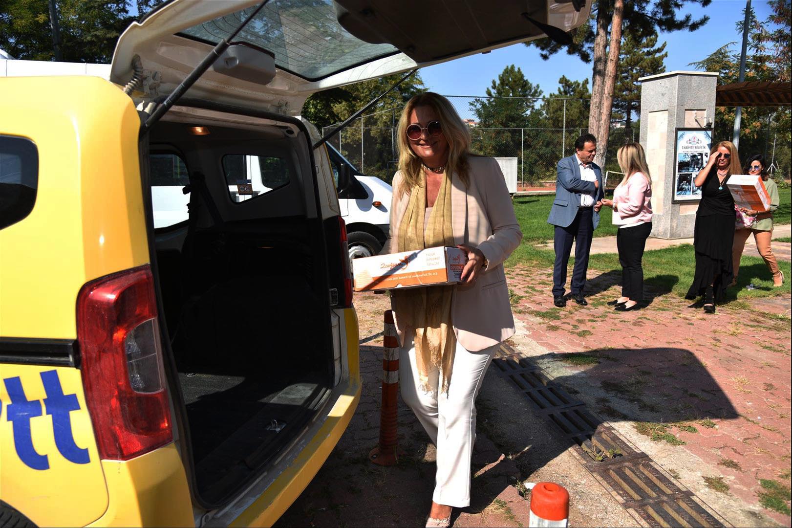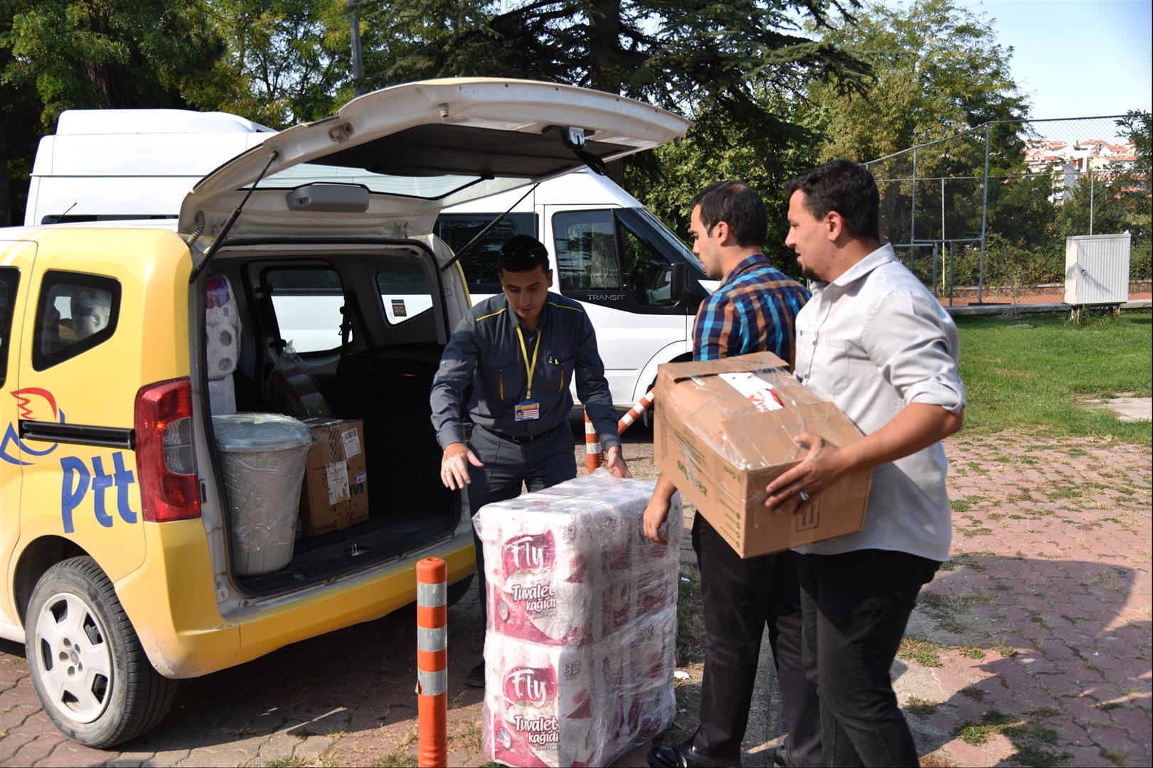 Bilecik Tarihi Saat Kulesi önünde hazırlanan malzemeler, Bilecik Belediye Başkanı Semih Şahin, eşi Serpil Şahin ve projeye katkı sunan kurumların yetkilileri, hazırlanan kolileri kargo aracına yüklediler.