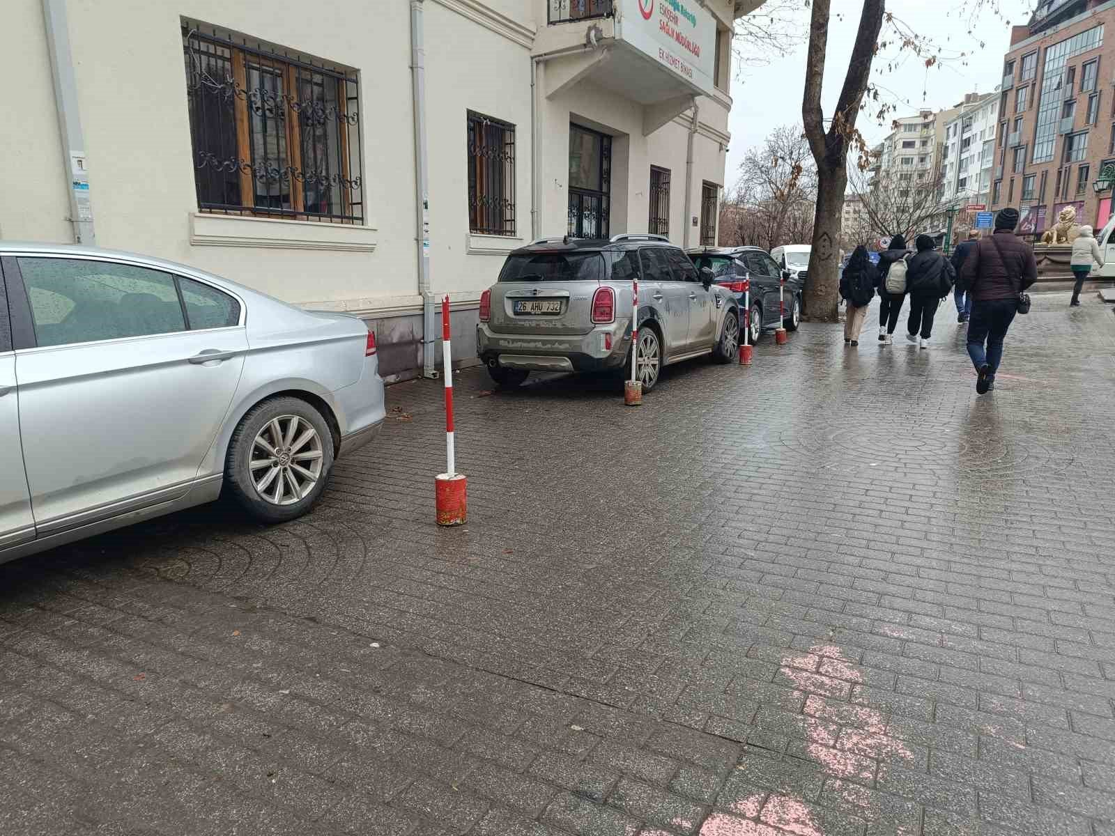 Odunpazarı ilçesi İstiklal Mahallesi’nde İki Eylül Caddesi ile Şair Fuzuli Caddesi’ni bağlayan sokağa yol boyunca park edilen araçlar görüldü. Normalde park yapılmasının yasak olduğu bilinen bölgede sürücülerin bu şekilde kuralları umursamayarak sokağı daraltması yayaların tepkisini topladı. Demir duba olarak kullanılan engellerde duyarsız sürücülere engel olamadı. Ayrıca, Eskişehir Sağlık Müdürlüğü Ek Hizmet Binası’nın önünün de park alanı haline çevrilmesi nedeniyle bir aşı nakil aracının kendi yeri yerine tramvay yolunun kenarında durduğu görüldü. – İHA