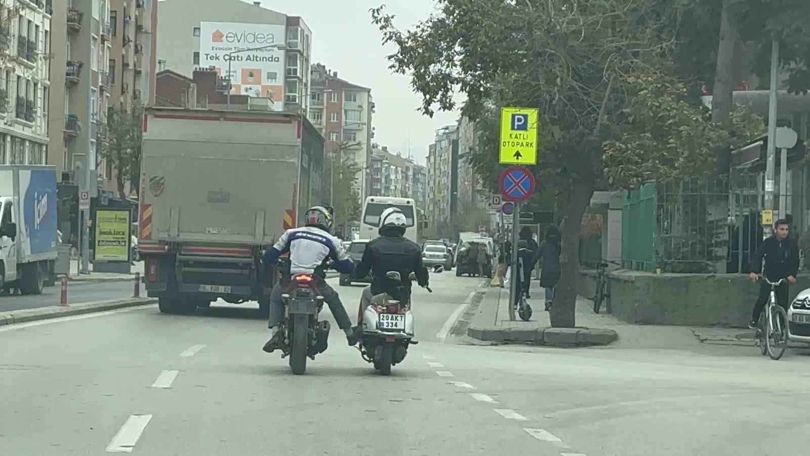 Olay, Eskibağlar Mahallesi Prof. Dr. Yılmaz Büyükerşen Bulvarı üzerinde meydana geldi. Edinilen bilgiye göre motosikletli bir sürücü, arkadaşının motosikleti bozulunca ayağını bozulan motosiklete dayadı ve ittirerek yolculuk yaptı. Duyarsız sürücüler, trafikte bu şekilde ilerleyerek tehlikeye davetiye çıkarırken, arkadaşını ittiren motorcunun plakasını söktüğü dikkatlerden kaçmadı. Yoğun trafiğe aldırış etmeden yan yana ilerleyen motorcular, diğer sürücüleri hayrete düşürdü. Motorcuların arkasında ilerleyen bir başka sürücü de o anları cep telefonu kamerasıyla kaydetti. – İHA