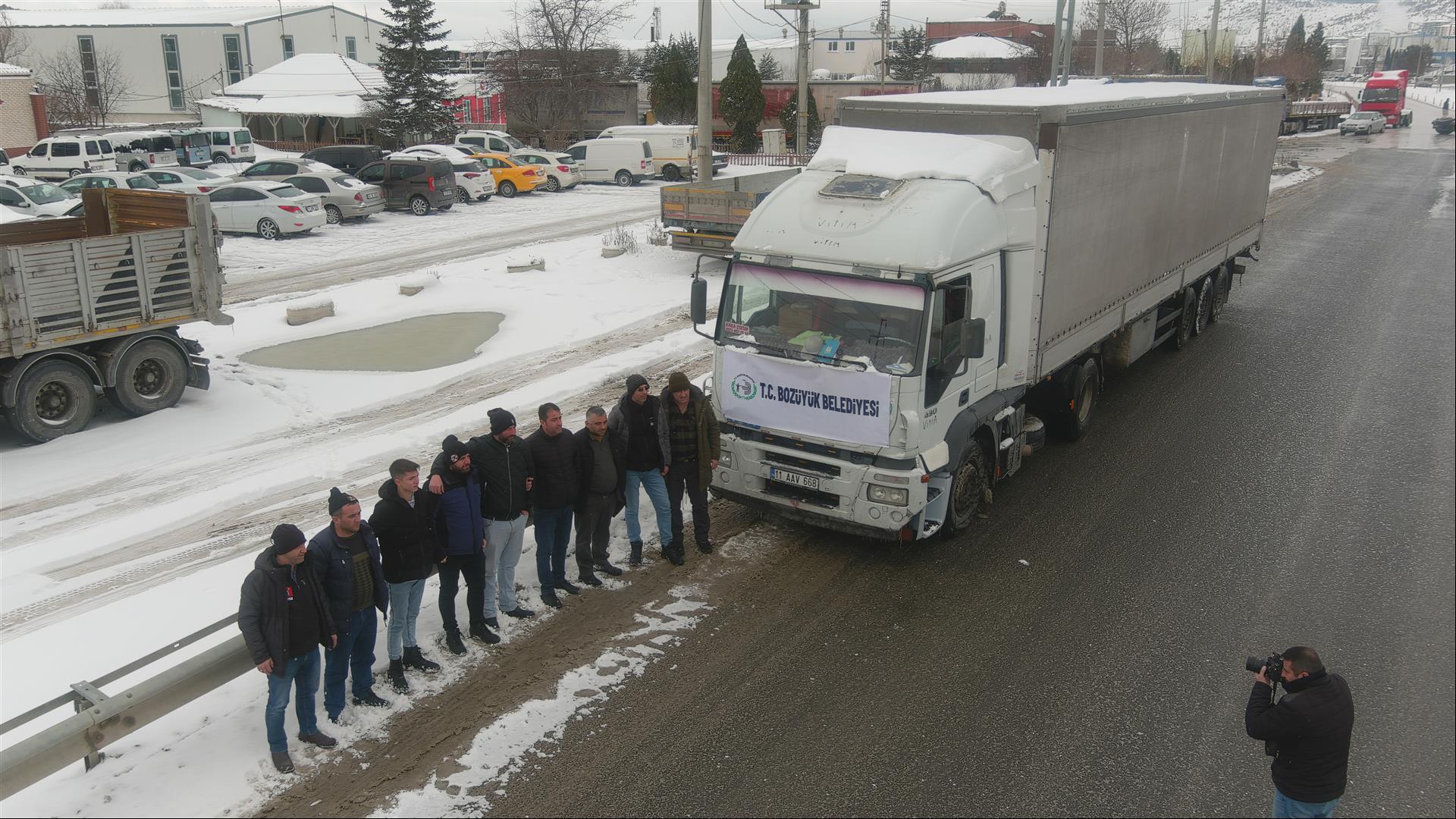 Bozüyük Belediyesi yardım tırı S.S. Bozüyük Motorlu Taşıyıcılar Kooperatifi tır parkından yola çıkarken gönüllü tır şoförünü Bozüyük Belediye Başkanı Mehmet Talat Bakkalcıoğlu, S.S. Bozüyük Motorlu Taşıyıcılar Kooperatifi Başkanı Arif Ercan ve kooperatif üyeleri uğurlayarak hayırlı yolculuklar diledi.