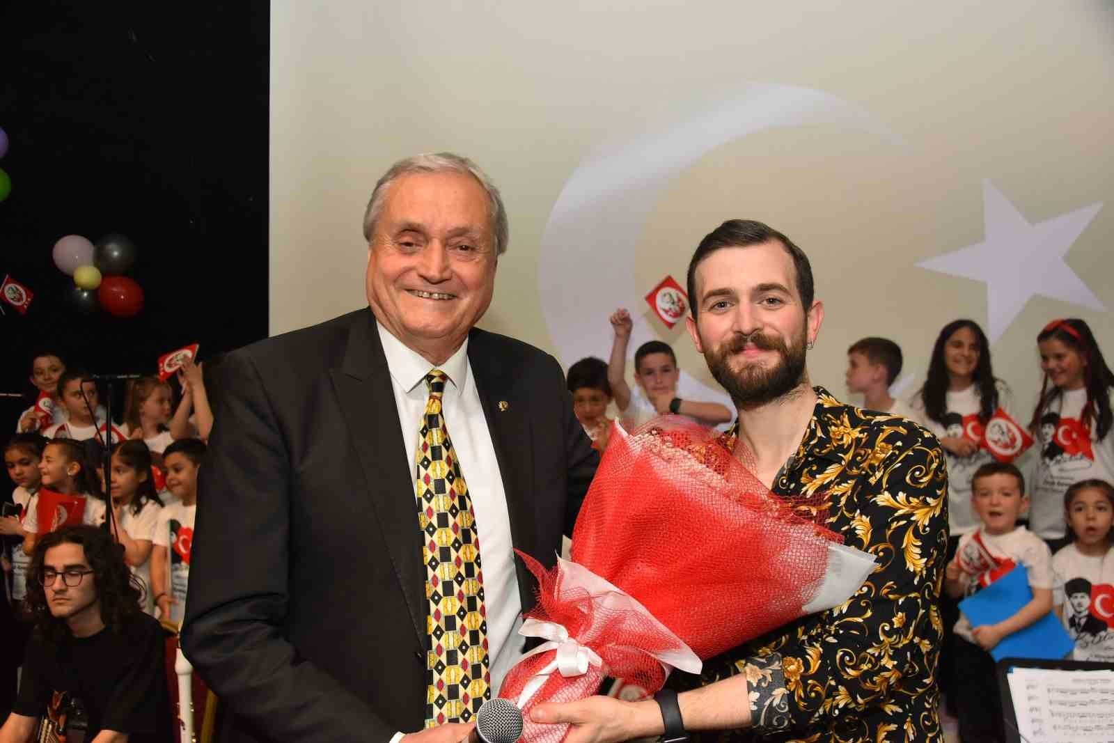 Başkan Bakkalcıoğlu ardından eşi Merih Bakkalcıoğlu ve Başkan Yardımcısı Ali Şahinoğlu ile birlikte Koro Şefi Murat Küçük’e çiçek takdim ederek korodaki tüm çocuklara da akıllı saat hediye etti.