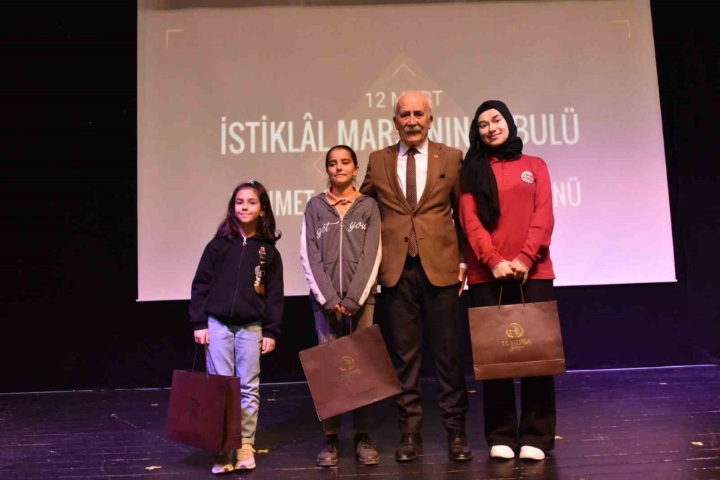 Okul müdürünün konuşmasının ardından program İstiklal Marşı’nı okuma yarışmasında ortaokul kategorisinde birinci olan öğrencinin İstiklal Marşı’nı okuması, günün anlam ve önemine uygun şiir okunması ve Kumral Abdal Anadolu Lisesi öğrencileri tarafından hazırlanan oratoryonun sunulması ile devam etti. Program 12 Mart İstiklal Marşı’nın kabulü münasebetiyle yapılan yarışmalarda dereceye giren öğrencilere protokol tarafından ödüllerinin takdim edilmesi ile sona erdi. – İHA