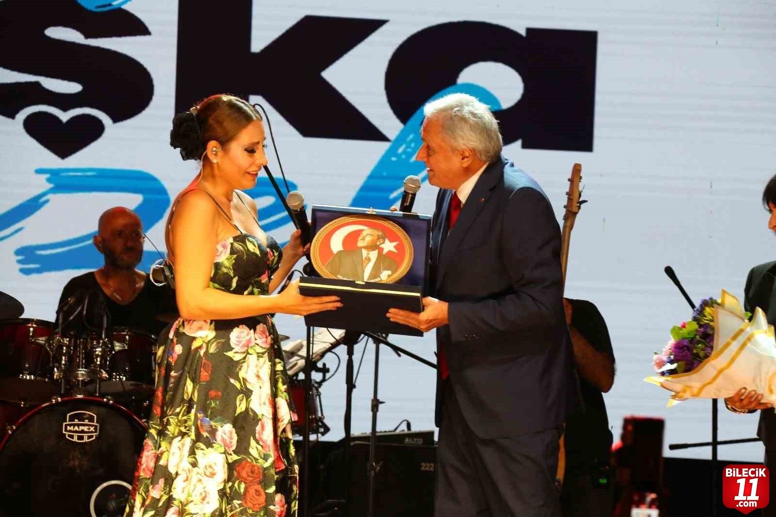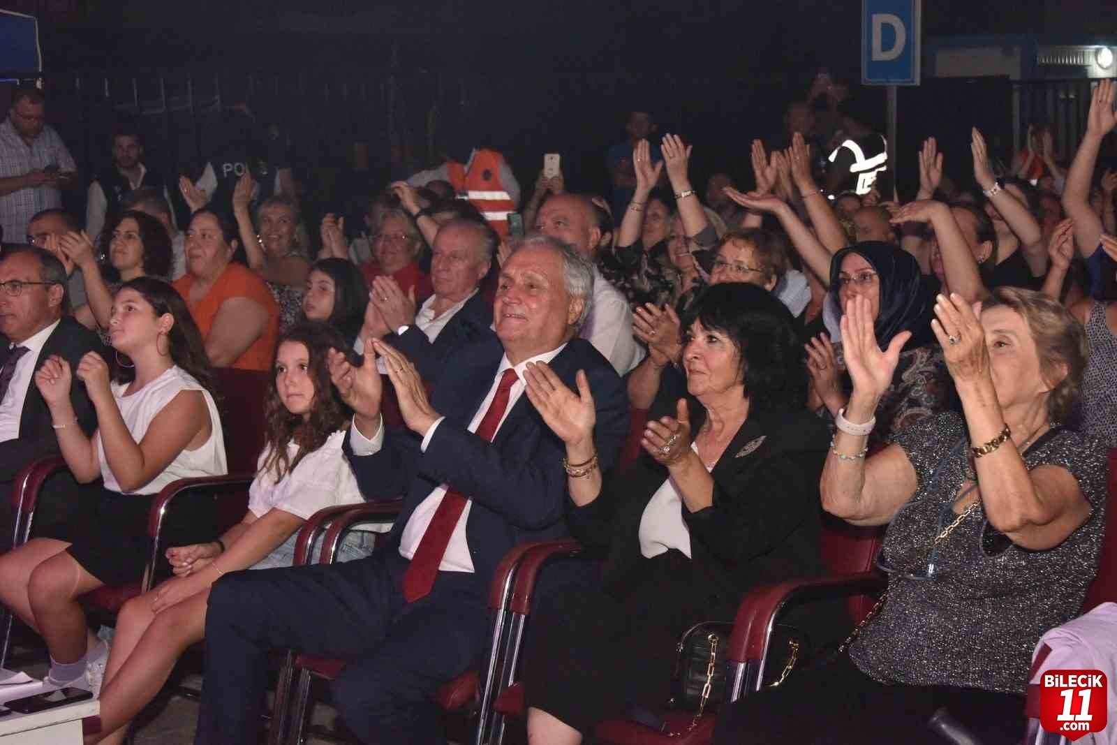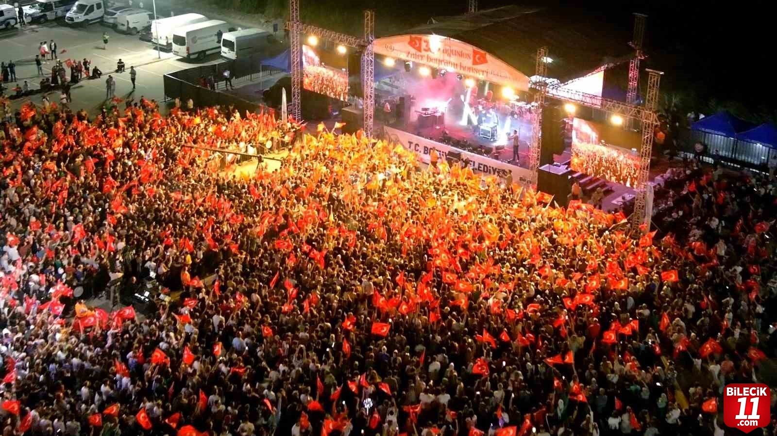 Konser programı 10. Yıl Marşı ve muhteşem havai fişek gösterisi ile coşkulu bir şekilde sona ererken Başkan Bakkalcıoğlu, eşi Merih Bakkalcıoğlu ve Funda Arar ile birlikte izleyenlere karanfil attı. – İHA