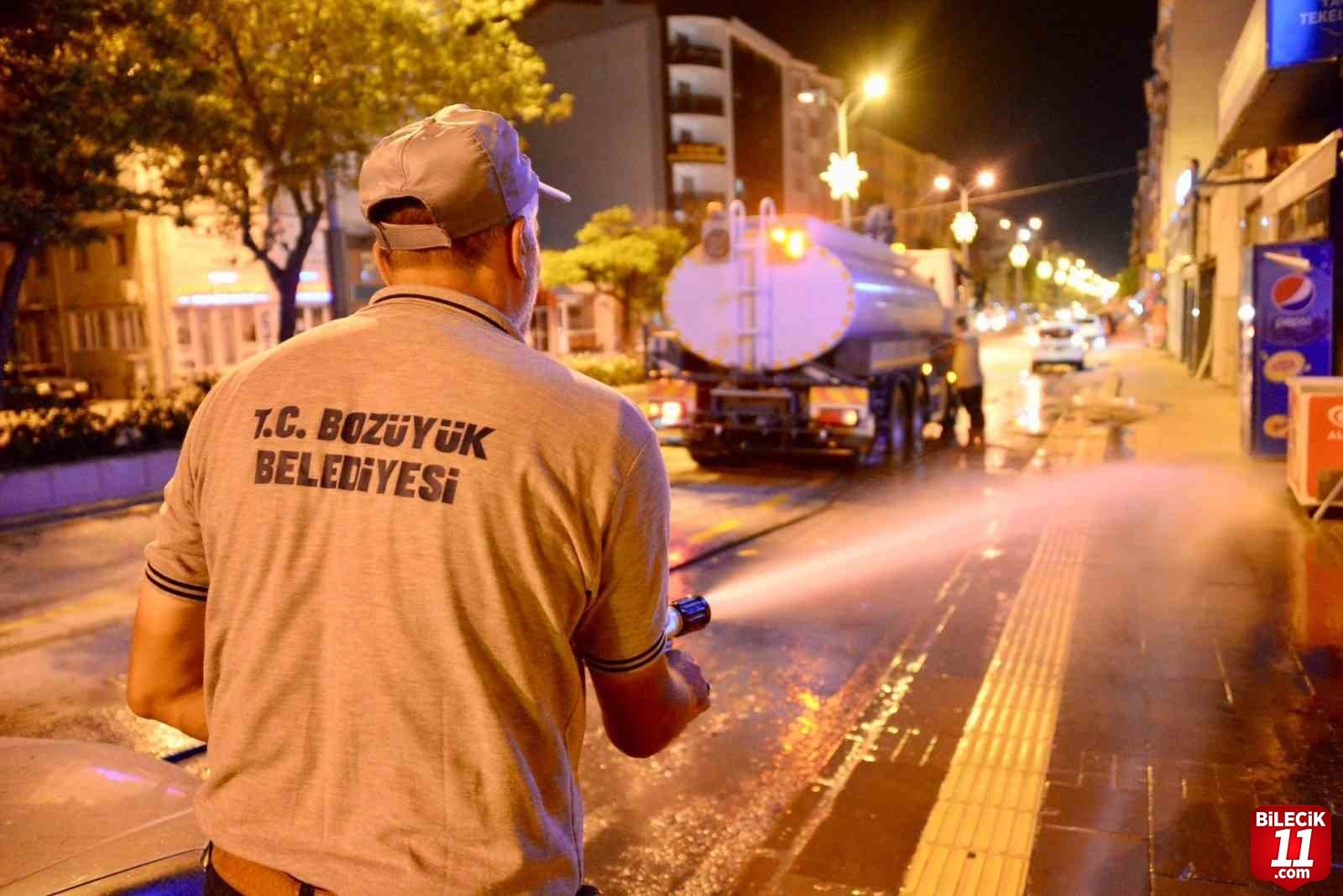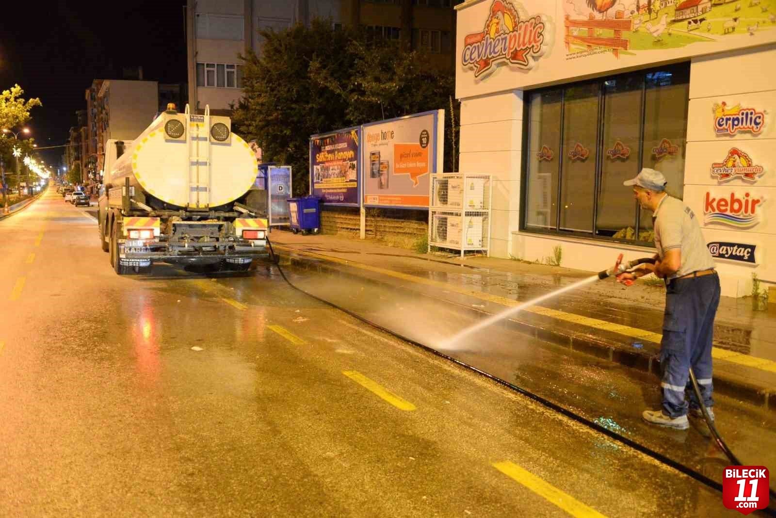 Bozüyük’te ana cadde ve kaldırımlar tazyikli suyla yıkanarak temizleniyor