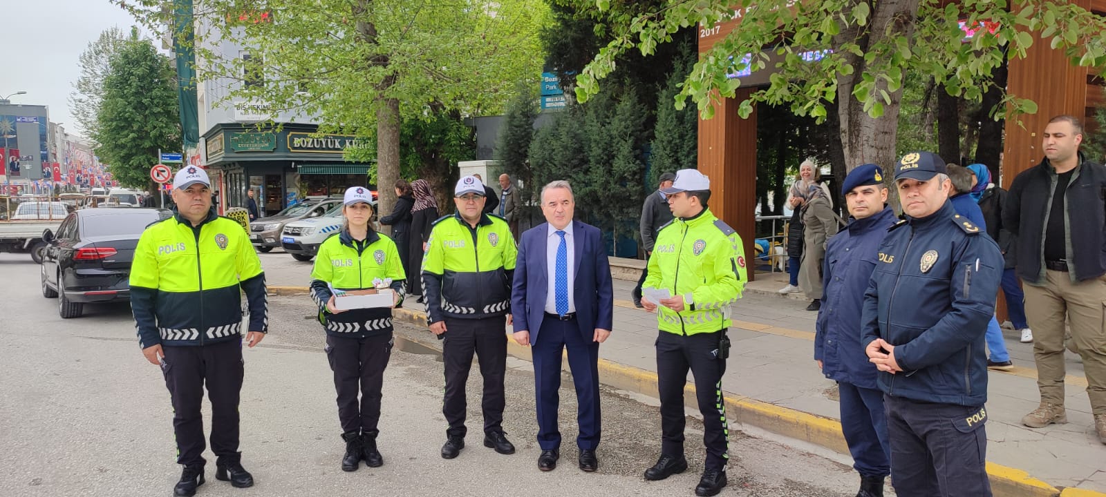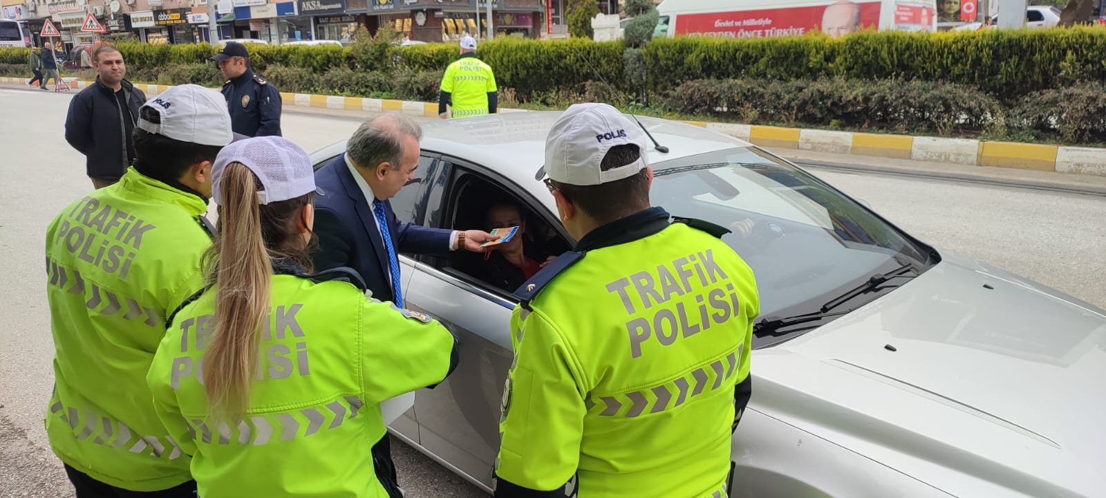 Kaymakam Adem Öztürk, İlçe Emniyet Müdürü Orhan Bozdemir ve İlçe Jandarma Komutanı Binbaşı Alper Soner Serin ile birlikte Karayolları Trafik Haftası etkinlikleri çerçevesinde ilçe emniyet ve jandarma ekipleri tarafından 'Bu yolda sana çok güveniyoruz' sloganıyla gerçekleştirilen trafik uygulamasına katıldı.