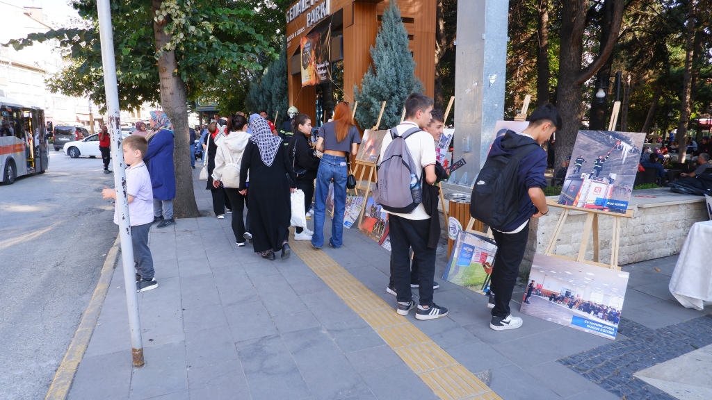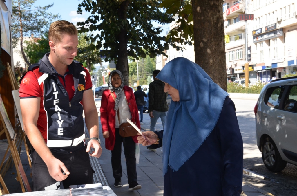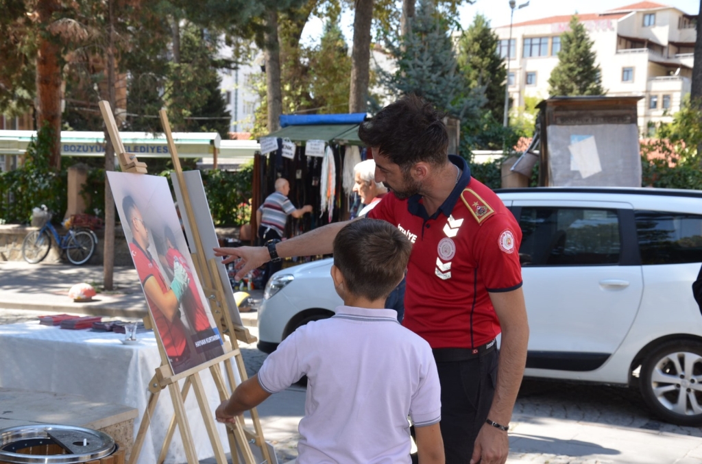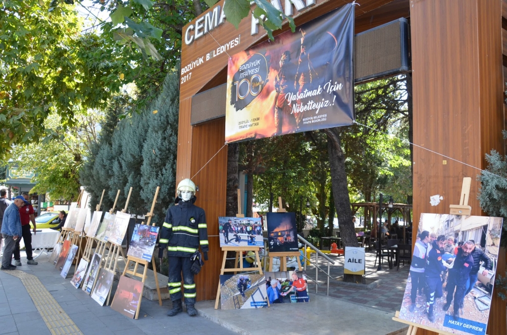 Bozüyük Belediyesi Cemalettin Köklü Parkı önünde düzenlenen etkinlikte Bozüyük Belediyesi İtfaiye Müdürlüğü çalışmalarının yer aldığı fotoğraflar ve itfaiye kıyafeti sergilendi. Aynı zamanda vatandaşlara yangın ve deprem anında neler yapmaları gerektiği konusunda bilgilendirici el broşürleri dağıtılıyor.