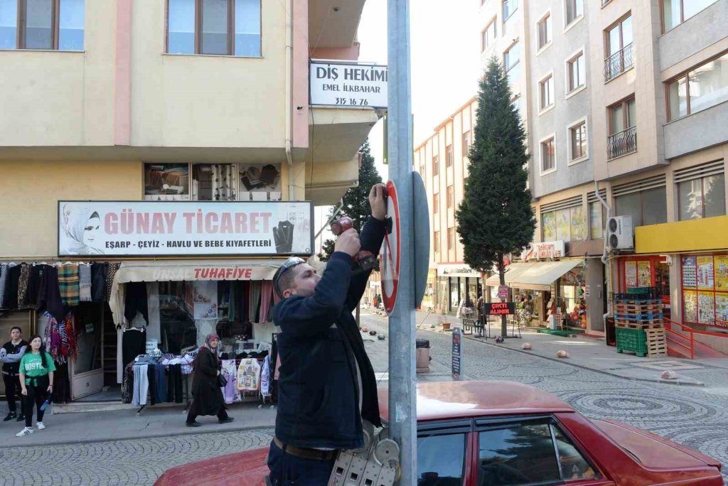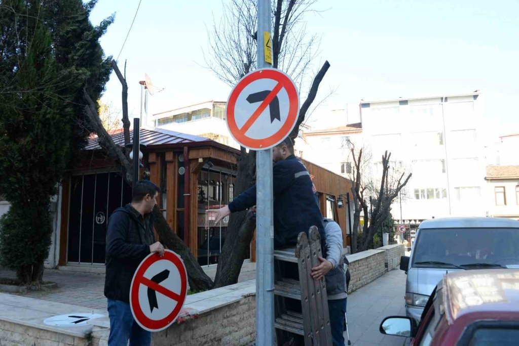 Belediye ekipleri mahallelerde zamanla eskiyen ve yıpranan yada araçların zarar verdiği yön ve trafik levhalarını, sürücülerin sürüş güvenliğini artırmak amacıyla yeniliyor, bakım ve onarımlarını gerçekleştiriyor. – İHA