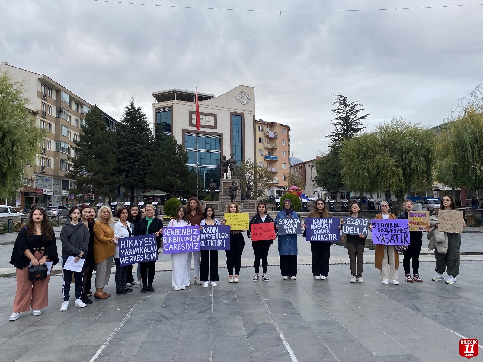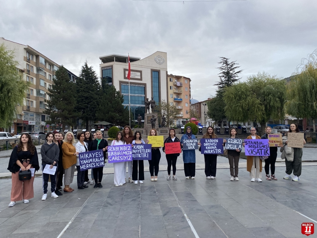 Bozüyük Cumhuriyet Meydanında ellerinde taşıdıkları dövizler ile toplanan kadınlar adına burada açıklama yapan Ebru Özbek şunları ifade etti: