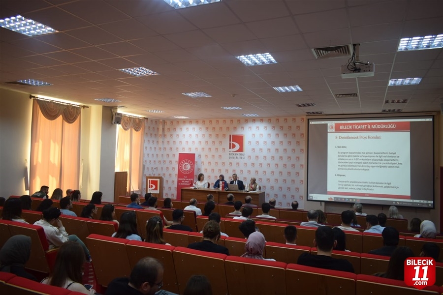 İktisadi ve İdari Bilimler Fakültesi konferans salonunda Prof. Dr. Sevgi Gönüllüoğlu modaratörlüğünde gerçekleştiren otumda Bilecik Ticaret İl Müdürü Şinasi Balta ve İnhisar Belediye Başkanı aynı zamanda Narinhisar Kadın Girişimi Üretim ve İşletme Kooperatif Başkanı Nihal Arslan Koyundere ve Ticaret İl Müdürlüğü Şefi Elif Demircan sunumları ile öğrencileri kooperatifçilik konusunda bilgilendirerek önemli katkılar sundu.