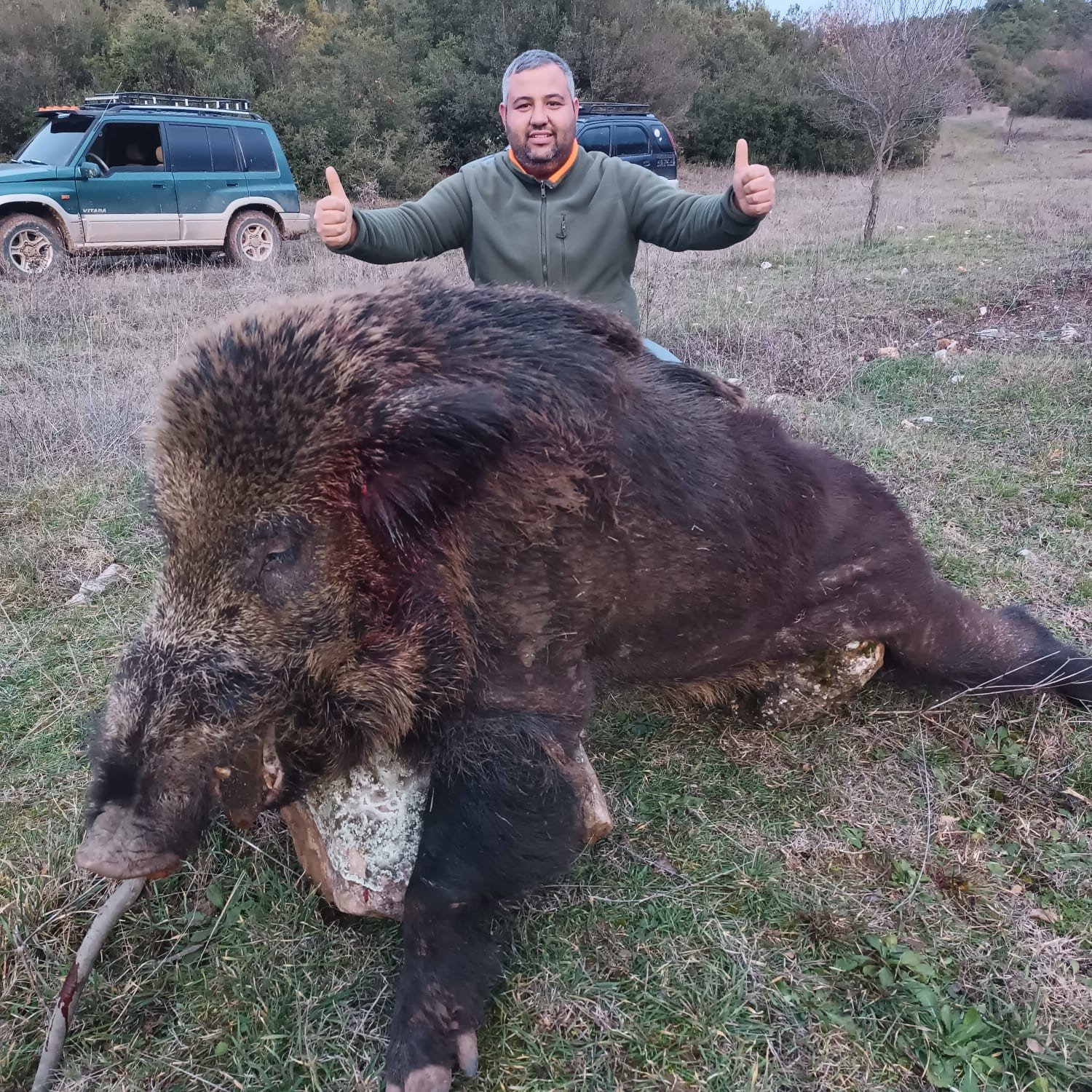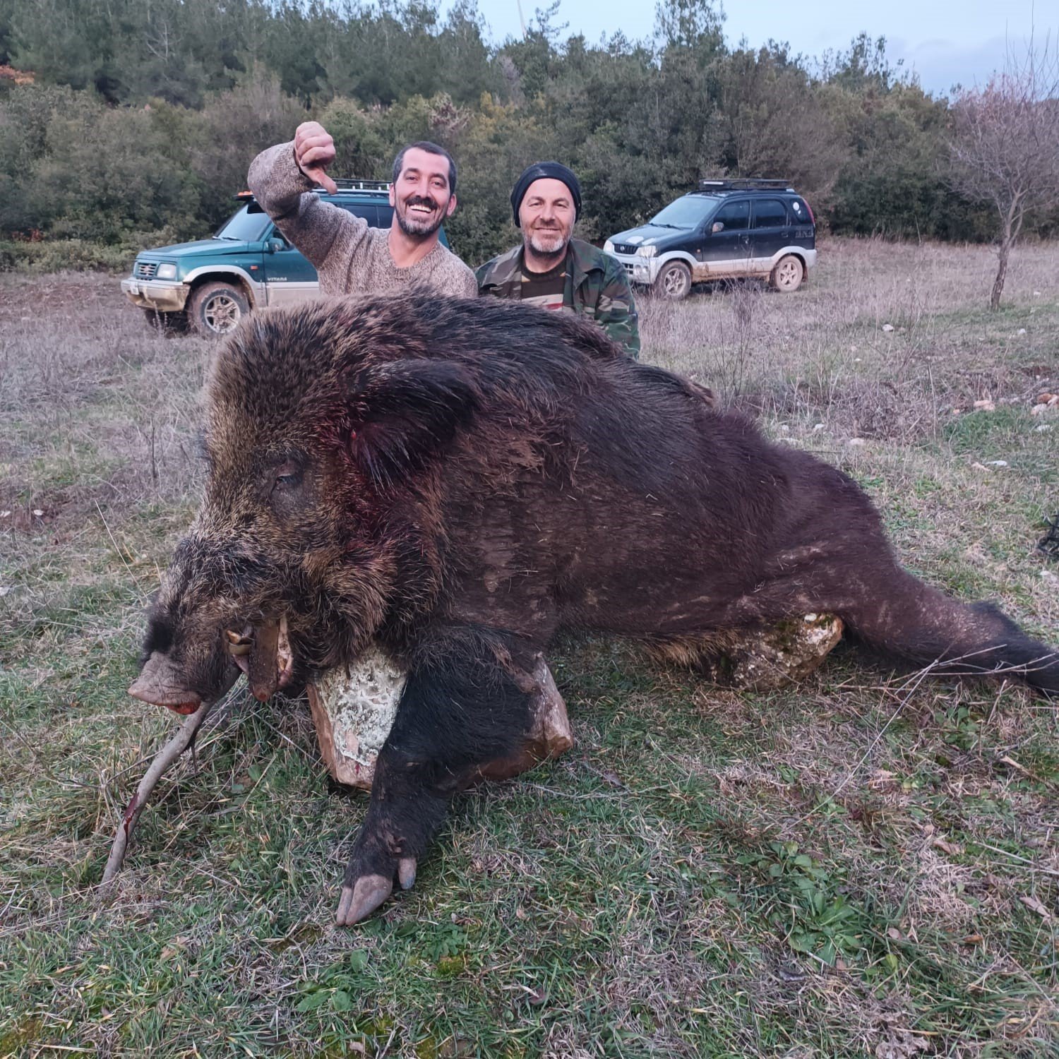 Bilecik merkeze bağlı Kuyubaşı köyünde yaşayan köylüler yaban domuzlarının tarlalara zarar verdiklerini belirterek avlanması için avcı Basri Kuş Taner Uçar ve Kemal Aybatı’dan yardım istediler. Tarım ve Orman Bakanlığı’ndan alınan iznin ardından araziye çıkan avcılar, Kuyubaşı bölgesinde uzun takibin ardından Basri Kuş’a ait av köpeklerini salarak 300 kilo ağırlığında bir domuz avladı. Domuzu araziden domuz 4×4 arazi arabasıyla çeken avcılar hatıra fotoğrafı çektirdiler.
