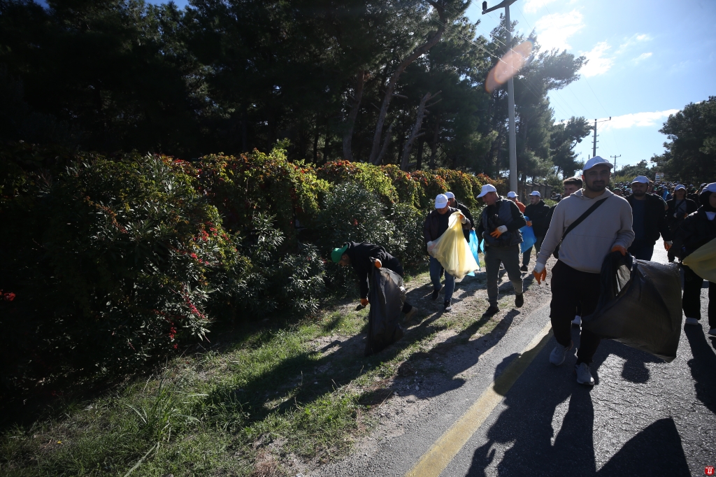 Yapılan anonsun ardından çevre temizliğine başlayan katılımcılar, belirlenen güzergahtaki cam ve plastik atıkları ayrı ayrı poşetlere topladı.