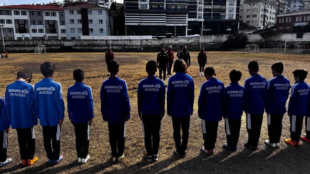 Mudanya Altai Spor Kulübü'nün Mudanya Stadı'ndaki antrenmanı öncesi düzenlenen törende, çeşitli yaş grubundaki sporcular saygı duruşunda bulundu, İstiklal Marşı okudu.