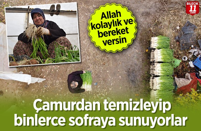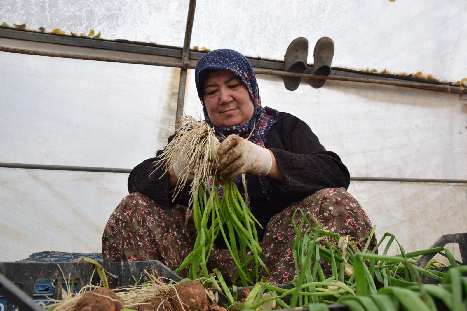 Yeşil soğanın hasadında ve temizliğinde çalışanların çoğunluğunu oluşturan kadınlar, sabah ev işlerini tamamladıktan sonra tarlada toplanan ürünleri çamurundan temizleyerek deste haline getiriyor.
