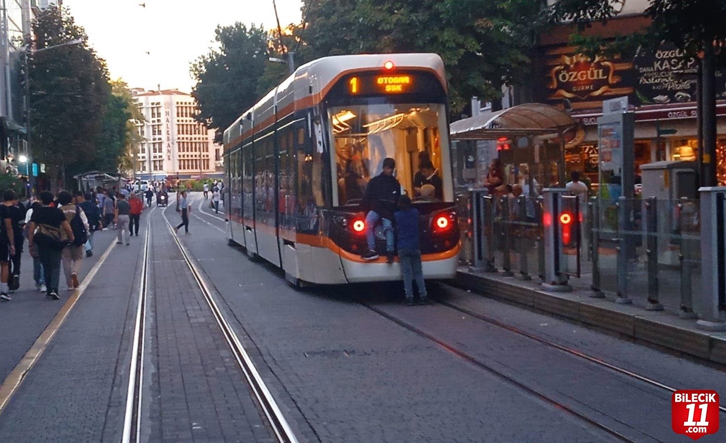 Eskişehir’de bir tramvayın uç kısmına tutunarak seyahat yapan iki küçük çocuk görenleri ‘bu kadar da olmaz’ dedirtti.