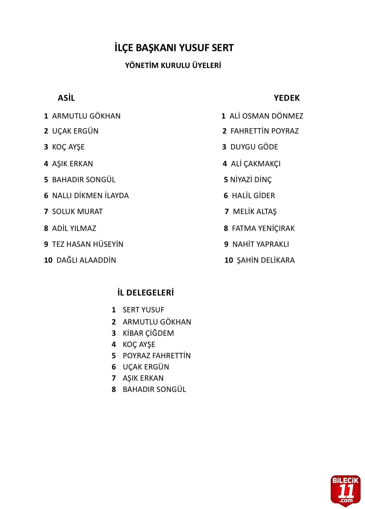 İlçe Başkanı Yusuf Sert’in Asil ve Yedek Yönetim Kurulu Üyeleri ile İl Kongre Delegeleri;