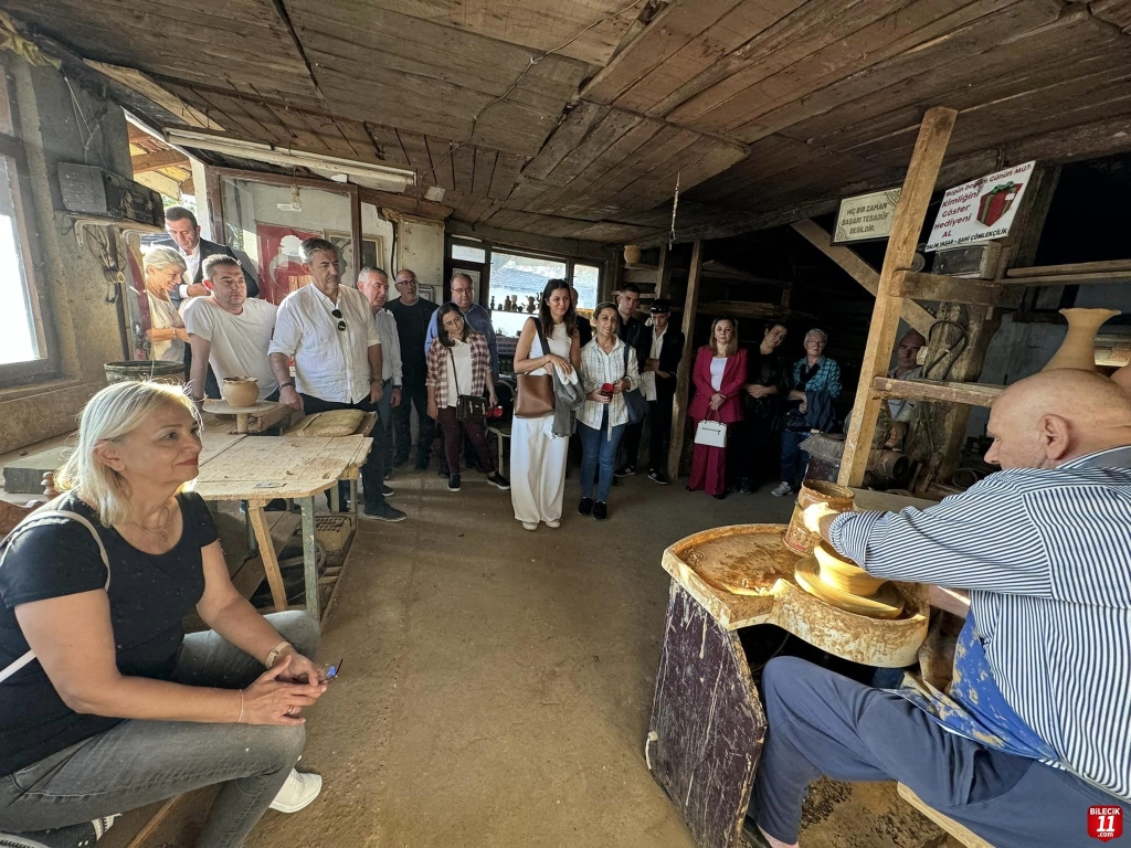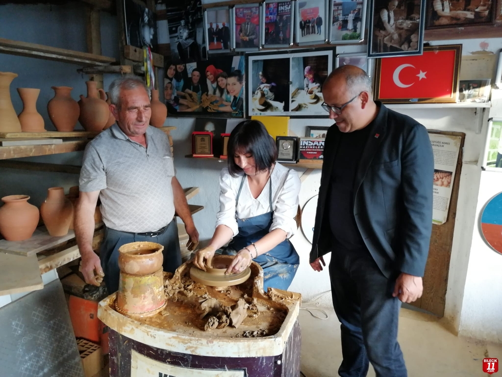 Bozüyük ziyaretlerinin ardından Pazaryeri ilçesine geçen CHP’li başkanlar Kınık Köyü’nde Çömlek Ustası Salim Yaşar’a konuk oldular. Burada çömlek yapımını izleyen heyetten bazıları tezgahın başına geçerek deneyimde bulundu.