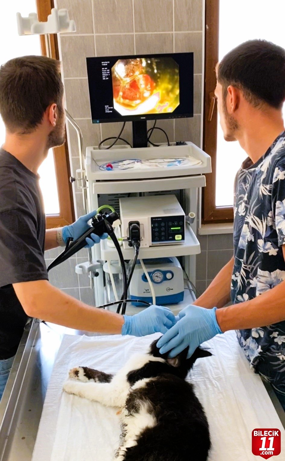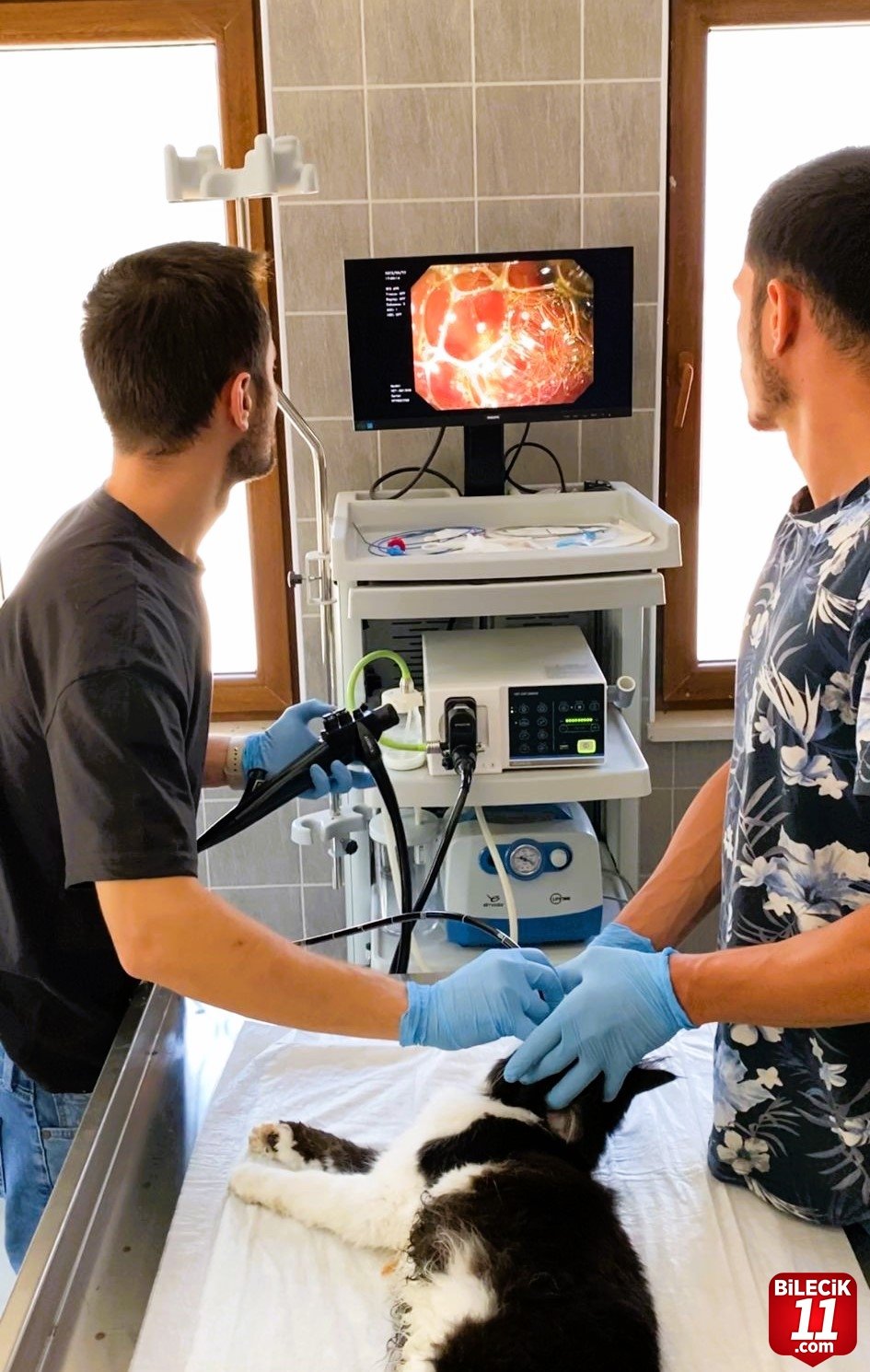 Yapılan kontrollerde bir sonuç alamayan görevliler, endoskopisini çekti. Çekilen endoskopide, ‘Cicoş‘ adını verdikleri kedinin midesinde parçalar olduğunu belirledi.