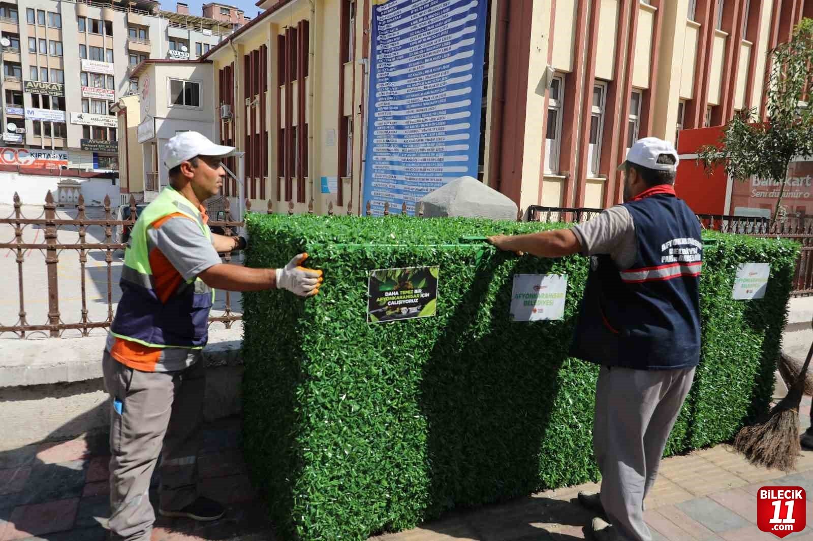Afyonkarahisar Belediyesi Temizlik İşleri Müdürlüğü’ne bağlı ekipleri kentin farklı noktalarında daha estetik bir görünüm sağlamak için çöp konteynerlerini suni çim ile kaplıyor.