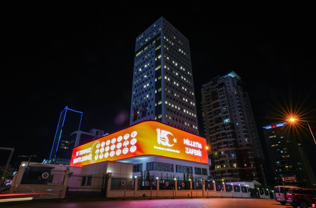 Cumhurbaşkanı Erdoğan’ın, “15 Temmuz Demokrasi ve Millî Birlik Günü’nü tebrik ediyorum.” şeklindeki mesajı, Başkanlığımız binasındaki dijital ekranında gösterildi.